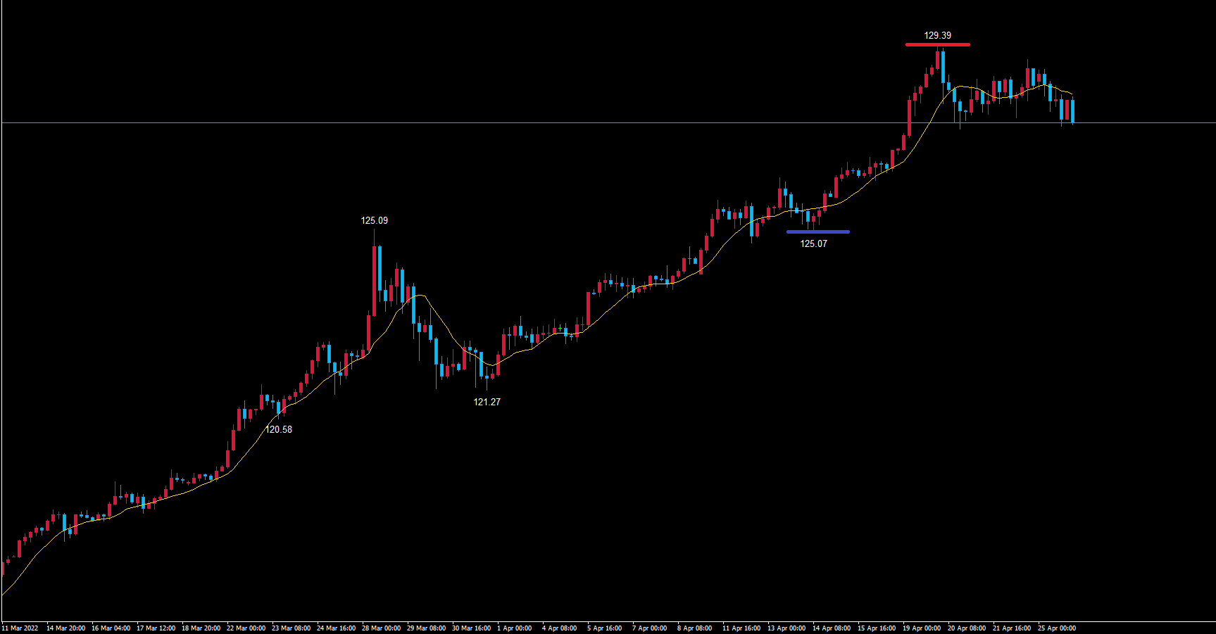 ドル円4時間サイクルは青のライン125.07から現在47本目です。