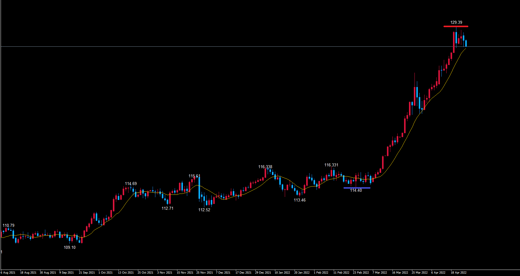 先程解説した様に4時間サイクルは赤のライン129.39で天井を付けていると見ているので、日足でも赤のライン129.39で天井を付けて底へ向けての下落に入っていると見ています。