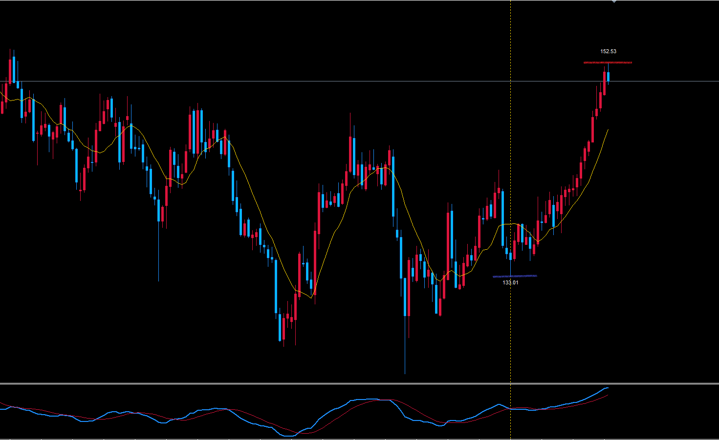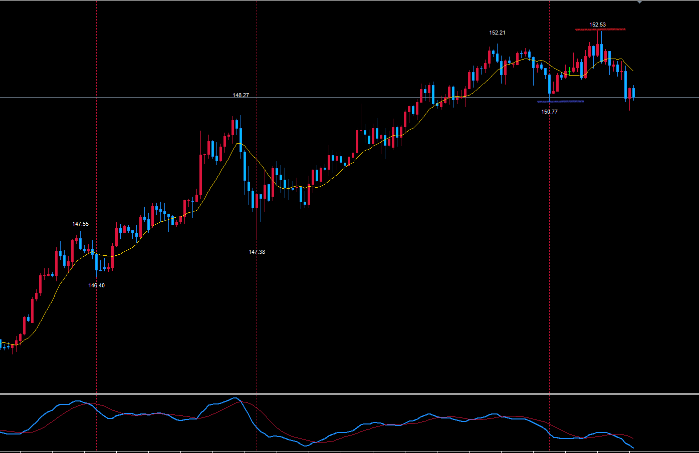152.53が天井になった場合、週足サイクルでは底へ向けての下落になるので相場を下目線も持ちながら見ています。