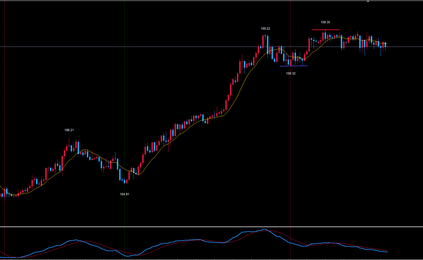 前回お伝えした108.32で反転後、17本目で高値109.35を付け現在レンジ相場ですね。