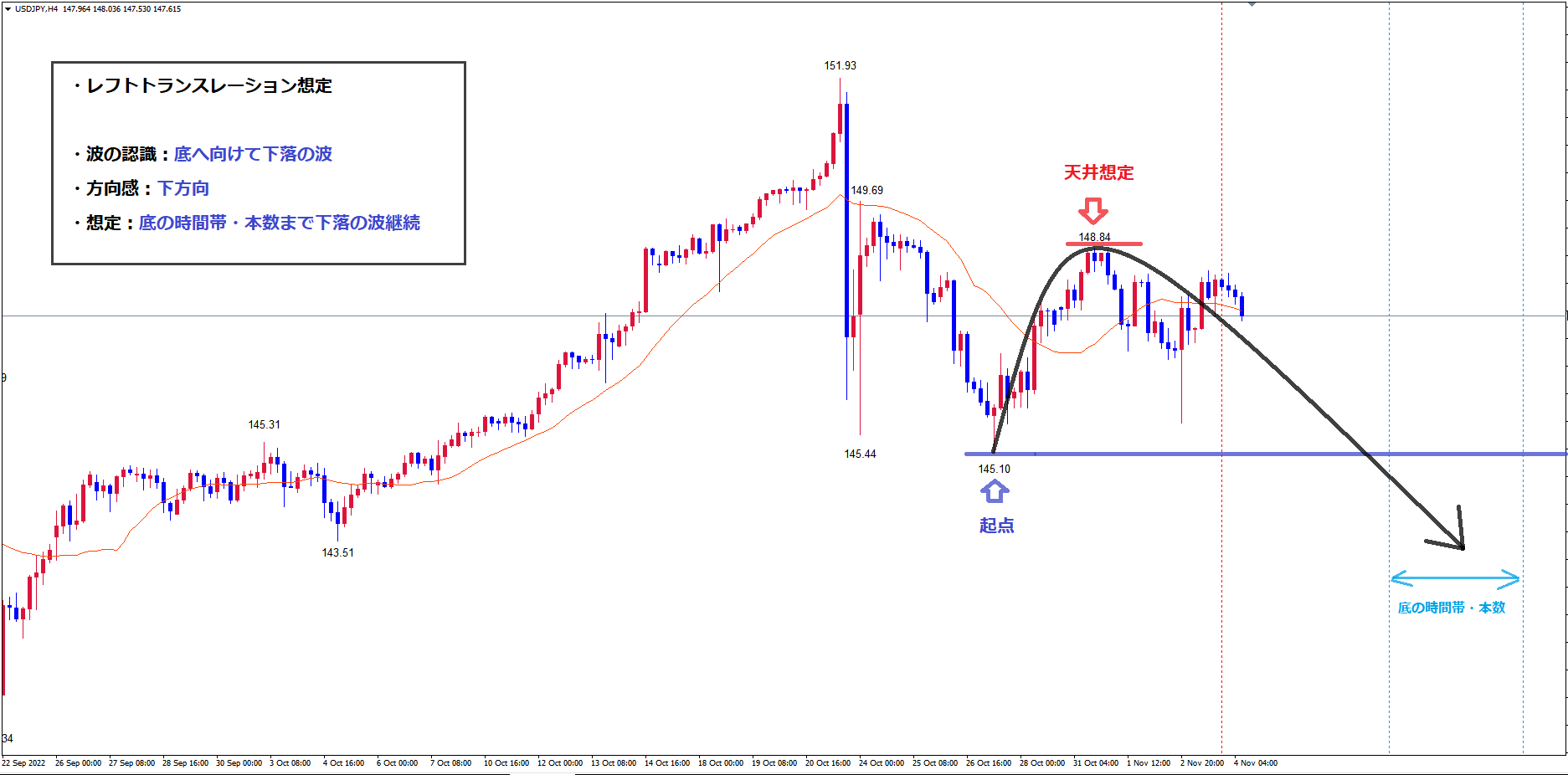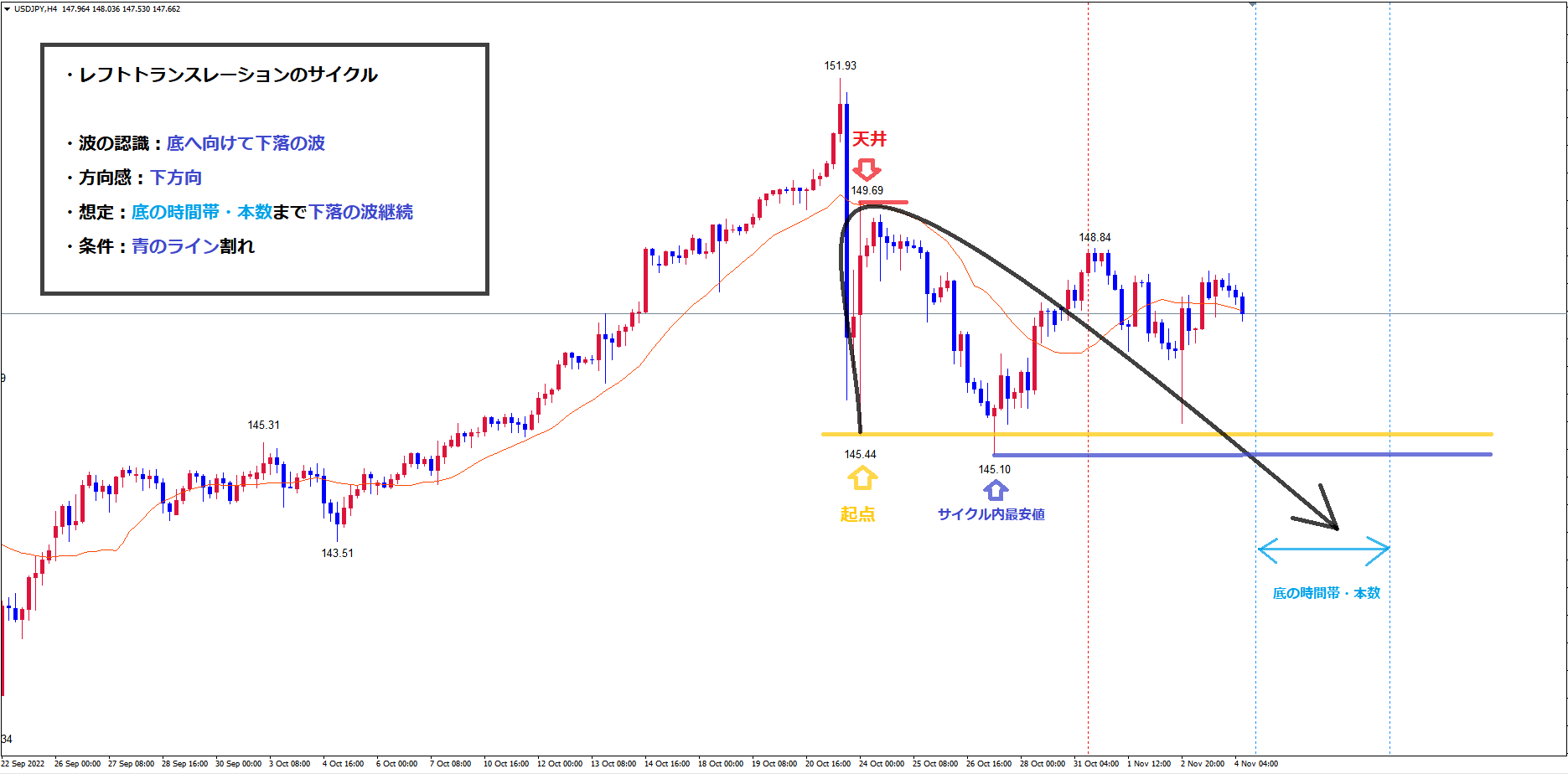 また、レフトトランスレーションのサイクルという事は今後起点の青のライン145.10は割れていくという事です。
