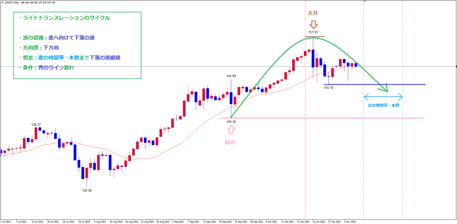 そして、今後起点の青のラインを割れてくればレフトトランスレーションのサイクルという事が確定するので下落ポイントとして注目していきます。