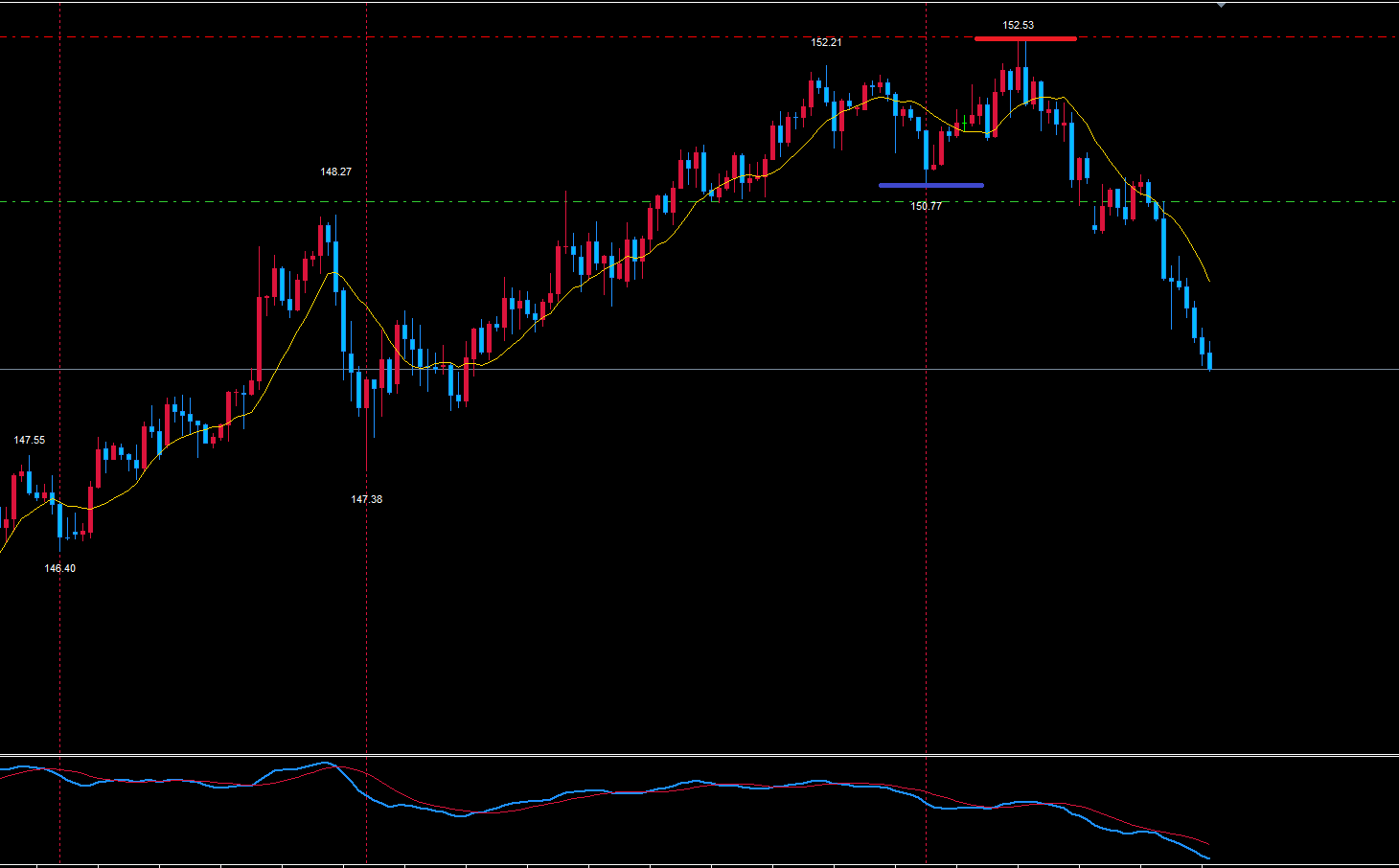 トレードは152.53を週足サイクルの天井想定で組み立てています。