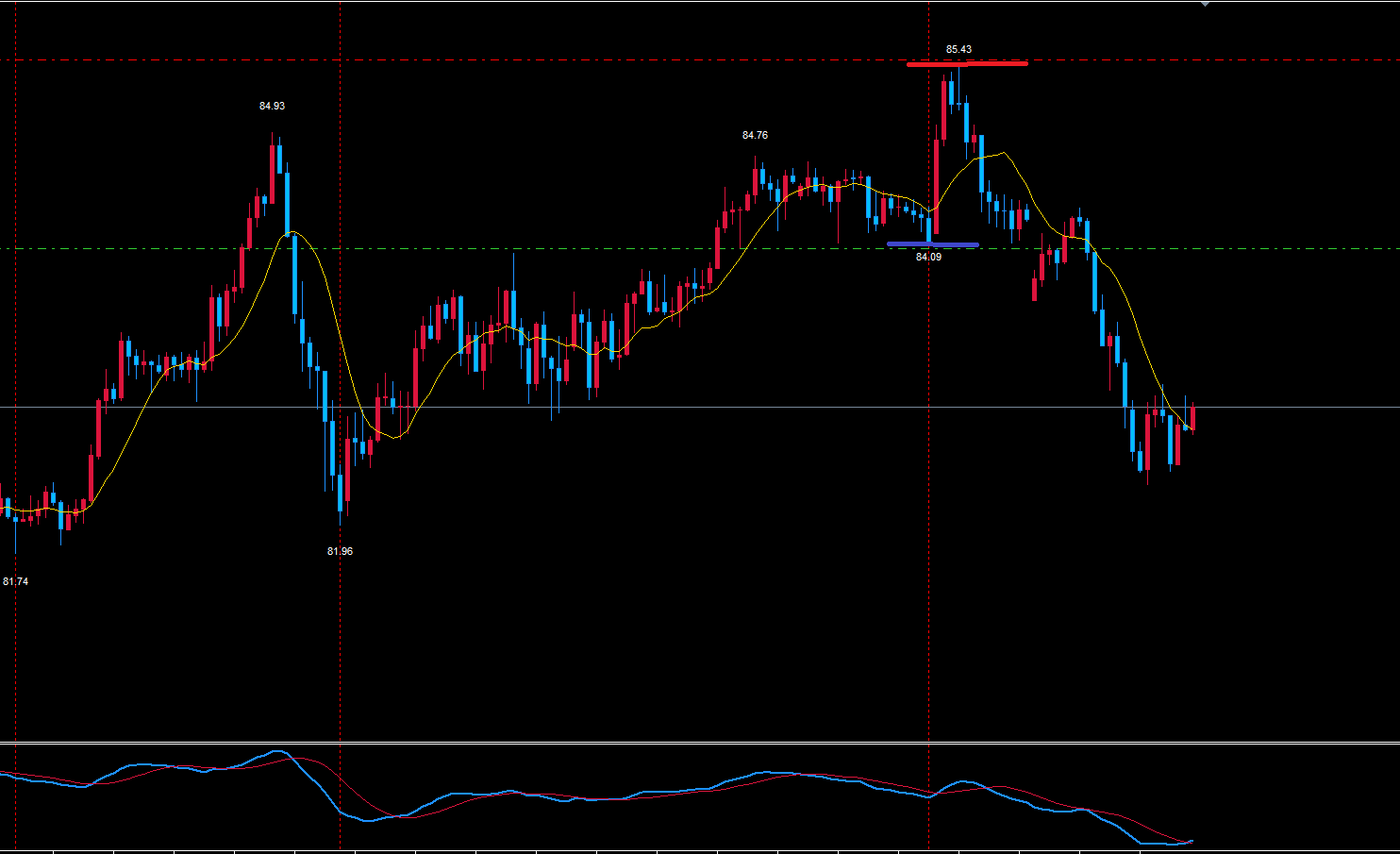 85.43が週足サイクルの天井と想定してのトレードになります。