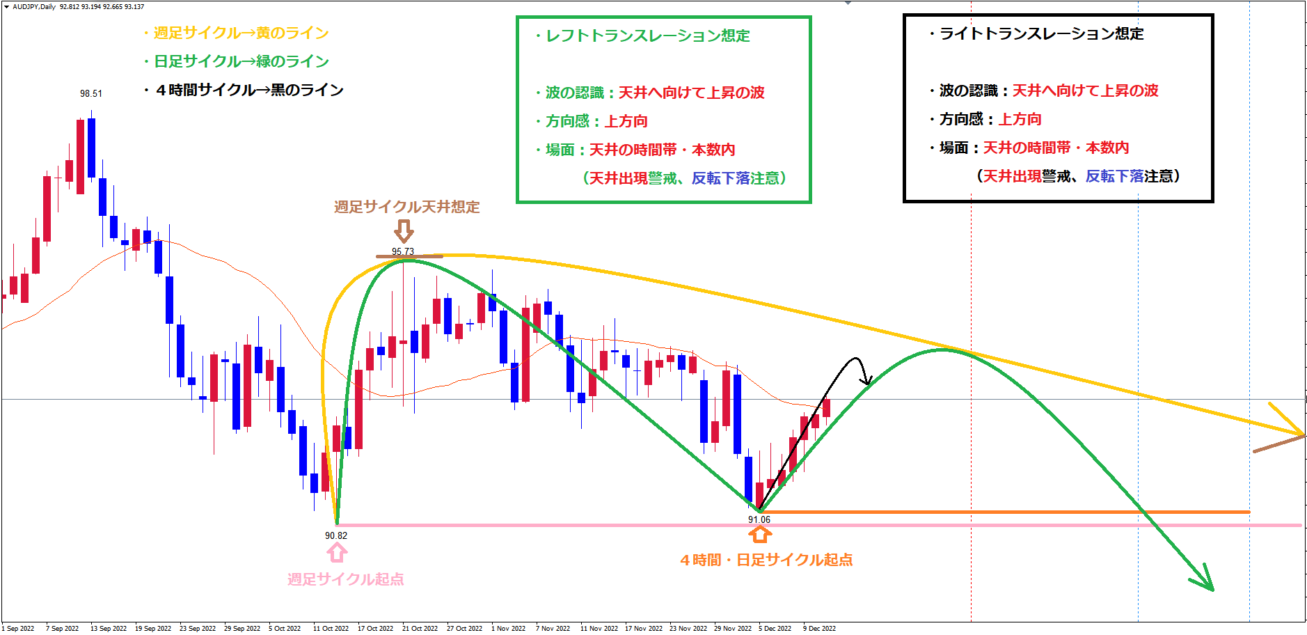 日足サイクルはオレンジのラインからスタートしていてもレフトトランスレーションの可能性が高く、