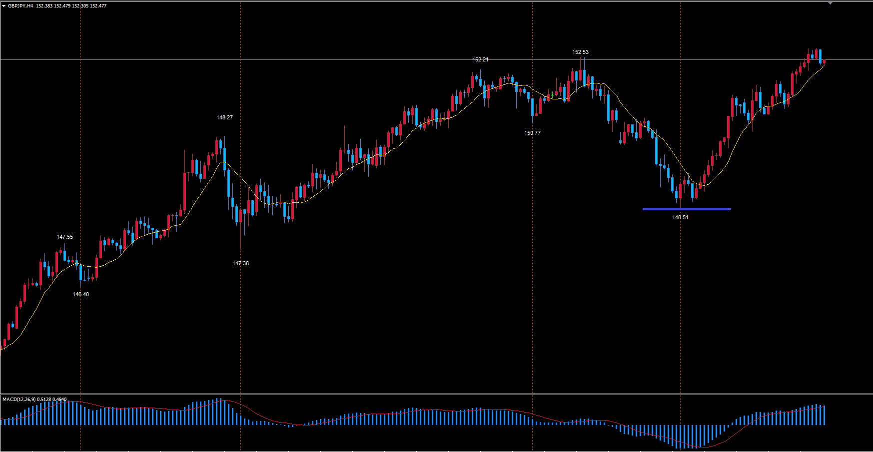 なので現在の4時間サイクルは起点148.51で現在37本目と見ていきます。