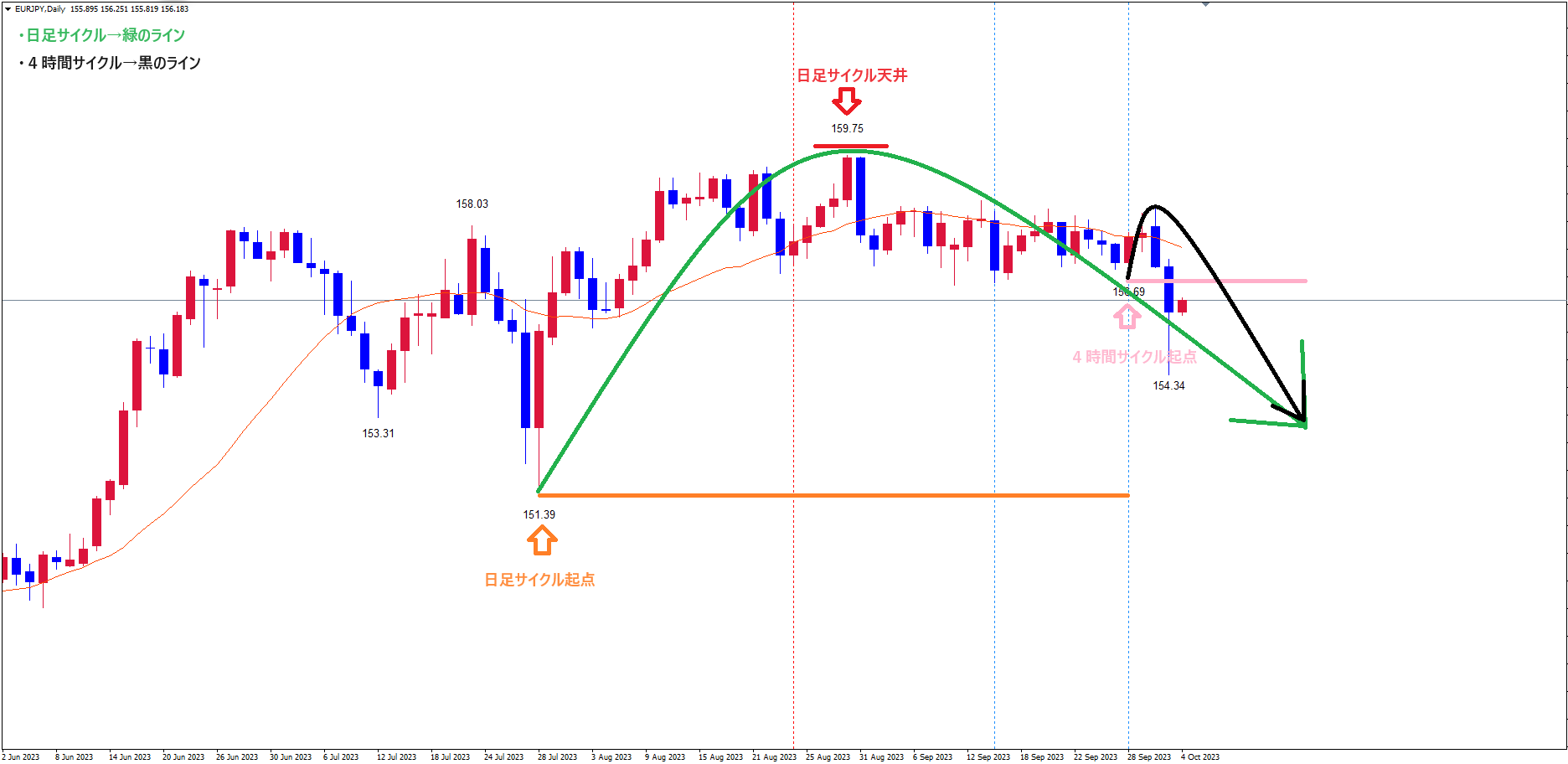 パターンとしては、起点桃のラインからの4時間サイクル底 = 日足サイクル底 になるイメージです。