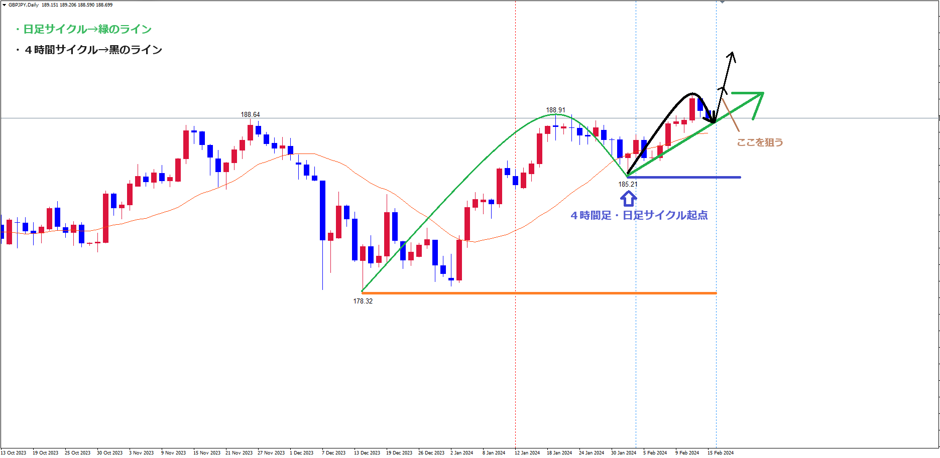 日足の上昇の波の押し安値 = 4時間サイクル底(下げ止まり)からロング狙いです。