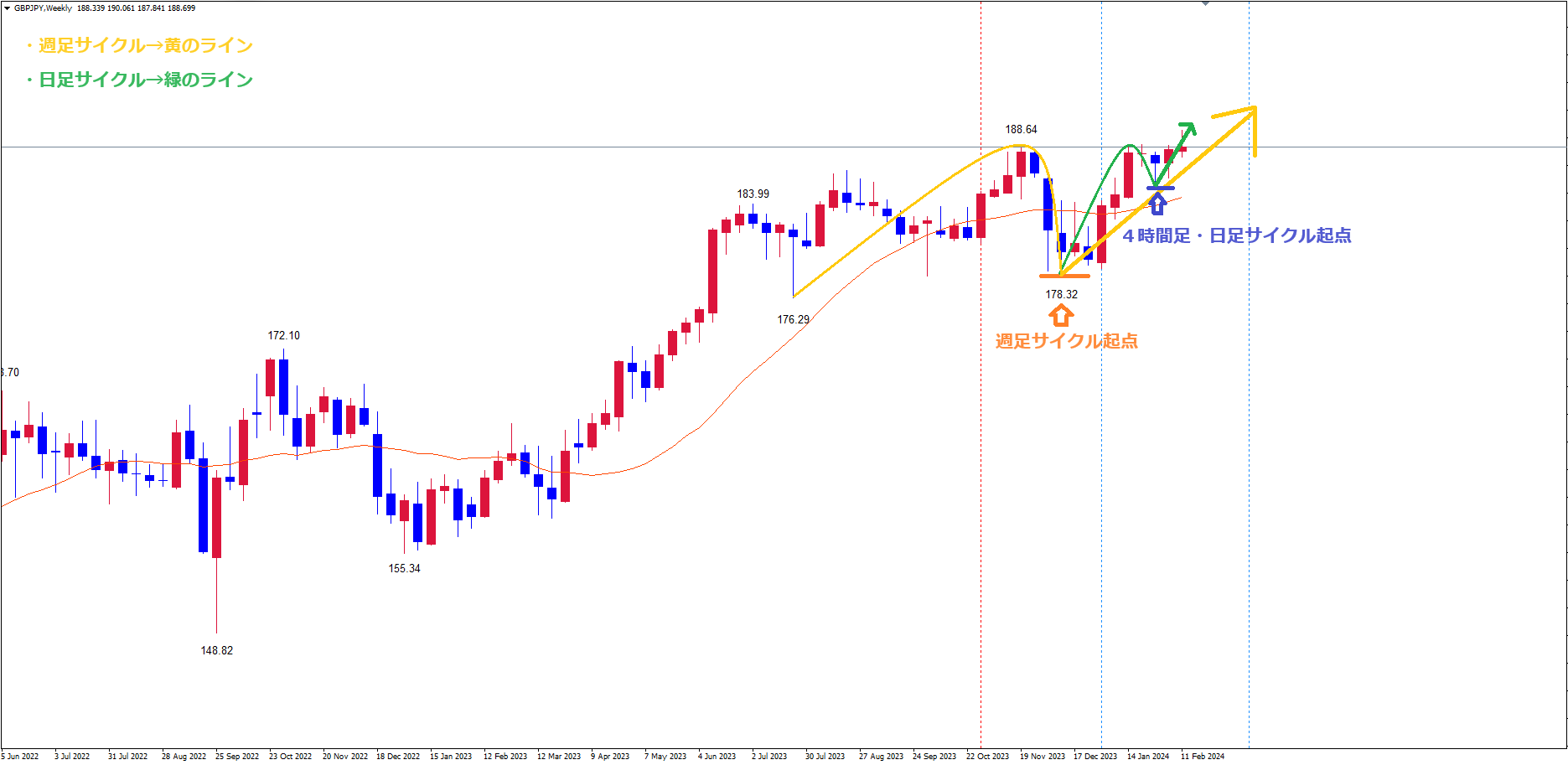 週足サイクルは、オレンジのライン(12/14の安値178.32)から現在10本目と見ています。