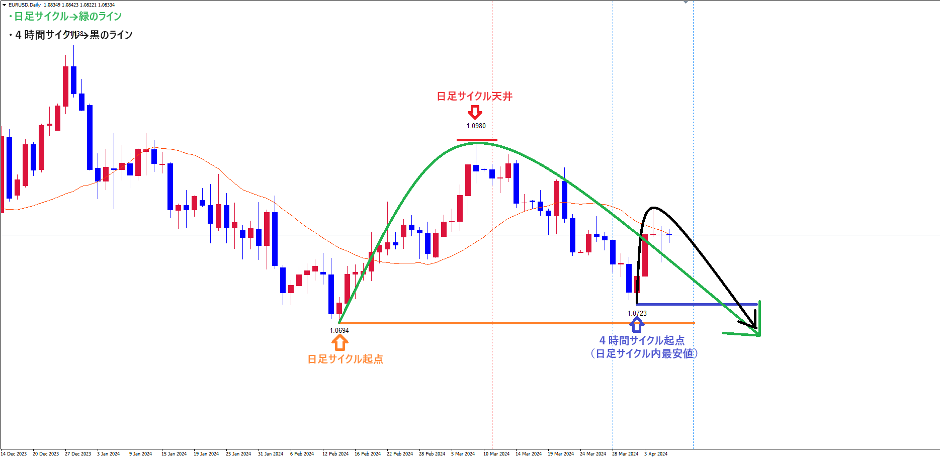 (パターン②)の場合、起点オレンジのラインからの日足サイクルも青のライン(4/2の安値1.0723)で底を付けて反転しているパターンで、