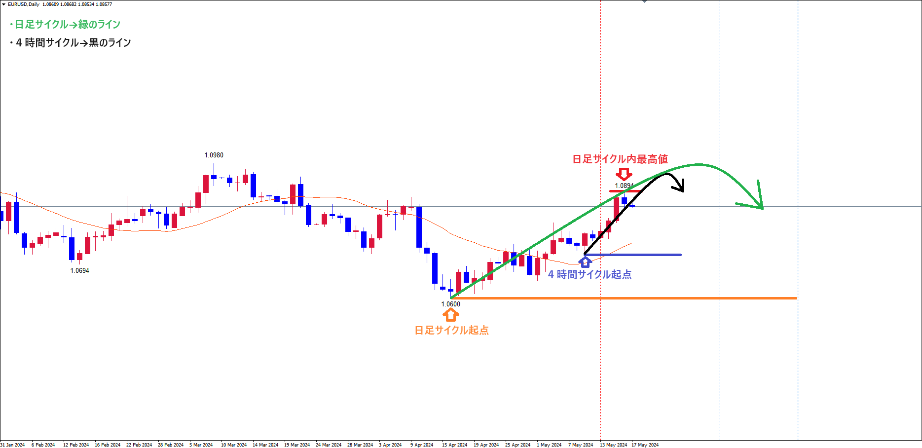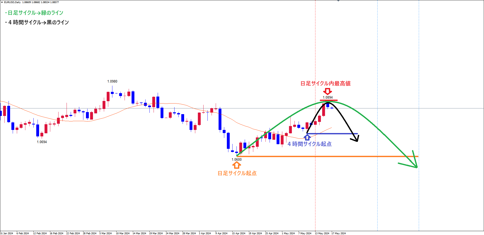 ・今回の4時間サイクルが、赤のライン(5/16の高値1.0894)を超えて天井を付け、ライトトランスレーションのサイクルを形成する場合