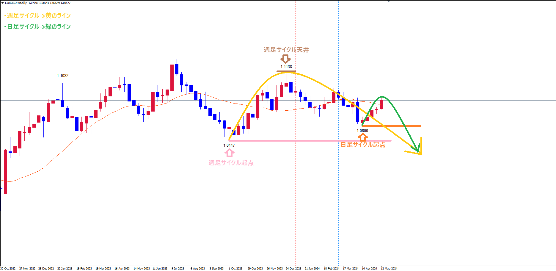 日足サイクルは、起点オレンジのライン(4/16の安値1.0600)から、現在24本目です。