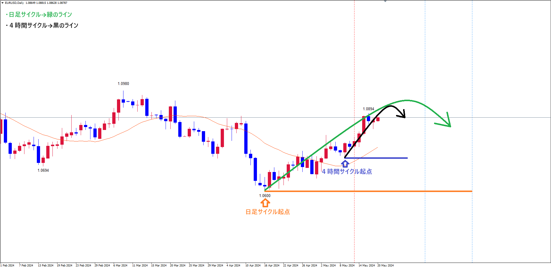 起点桃のライン(10/3の安値1.0447)からのサイクルが、赤のライン(5/16の高値1.0894)を超えて天井を付け、オレンジのライン(4/16の安値1.0600)で底を付けていて、
