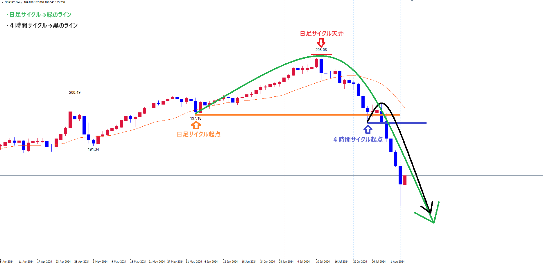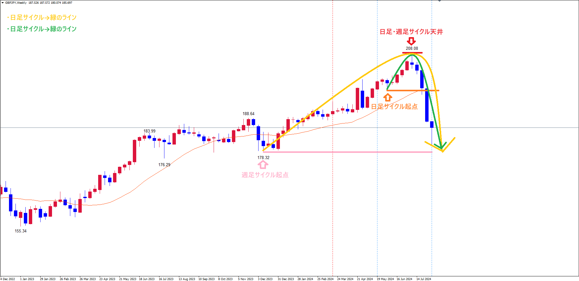 週足サイクルも、赤のライン(7/11の高値208.08)で天井を付け、サイクル底へ向けて下落の波、方向感:下方向 という認識で、