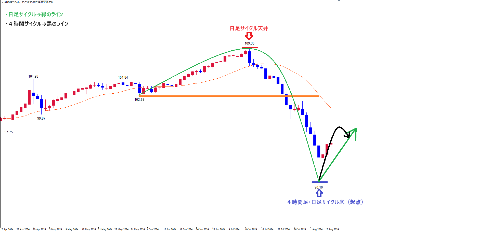 今回の4時間足・日足サイクルが、直近のサイクル内最安値青のライン(8/5の安値90.10)で底を付けている可能性が高まってきているので、