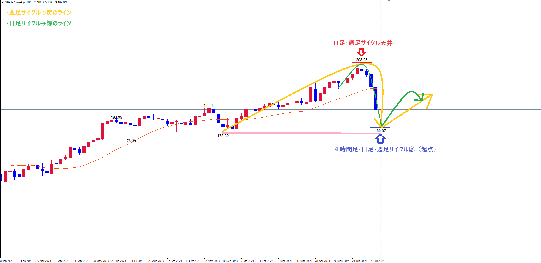 週足サイクルも直近のサイクル内最安値青のライン(8/5の安値180.07)で、底を付けている可能性も考え、反転上昇も警戒して見ていきます✅