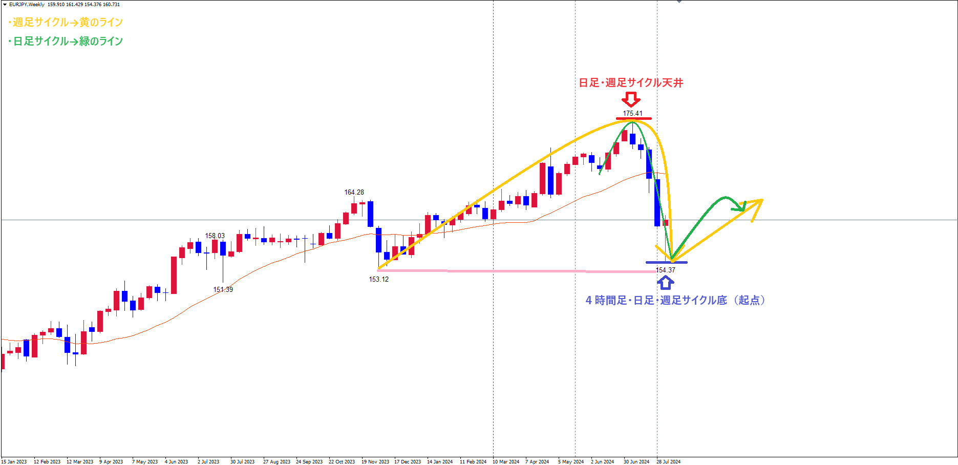 今回の4時間足・日足サイクルが、直近のサイクル内最安値青のライン(8/5の安値154.37)で底を付けている可能性が高まってきているので、