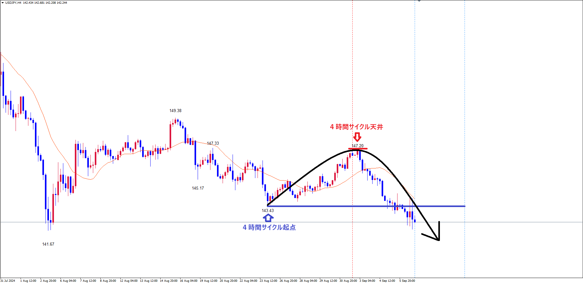 現在は、サイクル天井赤のライン(9/3の高値147.20)から、底へ向けて下落の波、方向感:下方向 という環境です✅