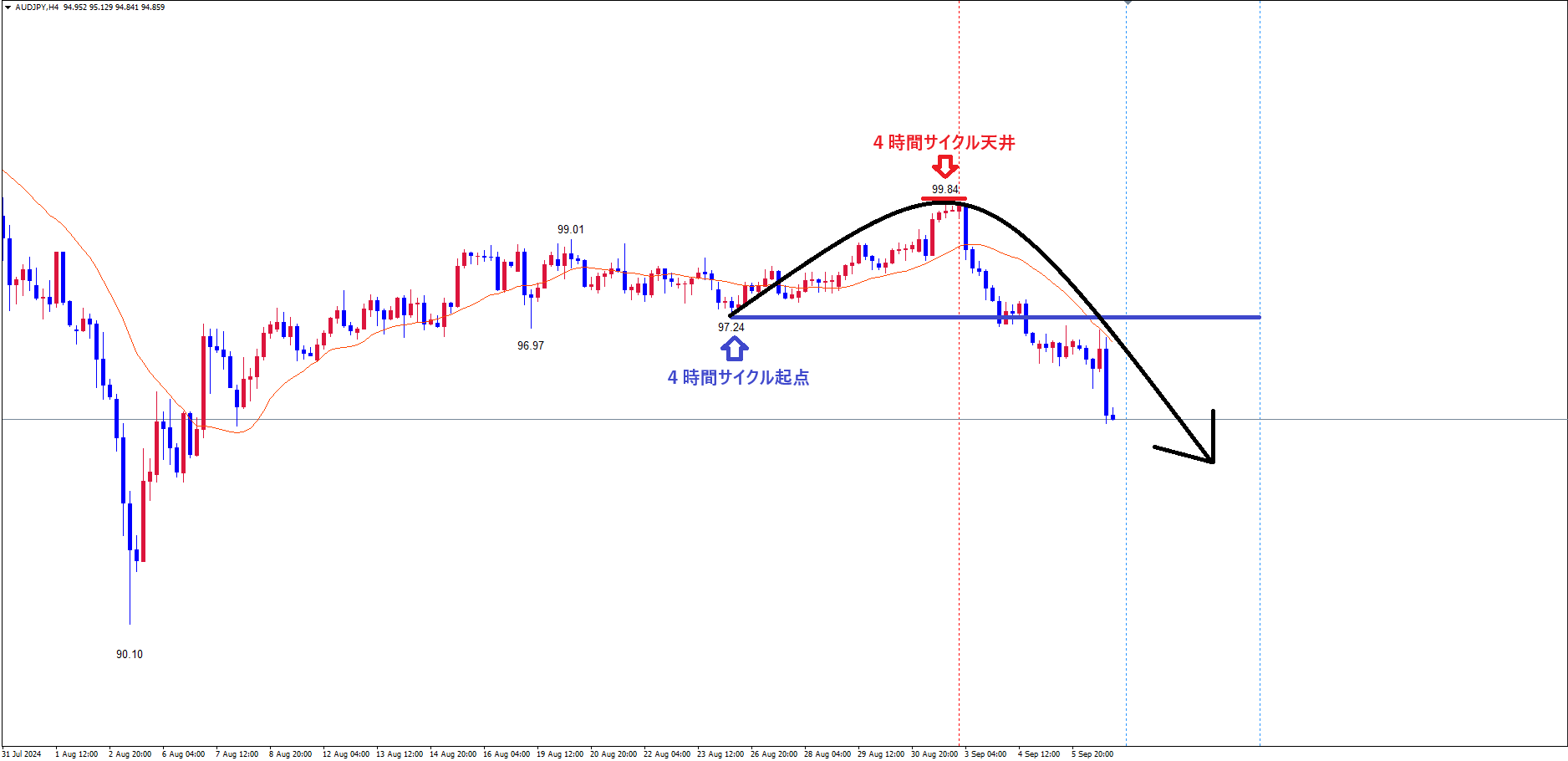 豪ドル円の4時間サイクルは、起点青のライン(8/26の安値97.24)から、現在58本目です✅