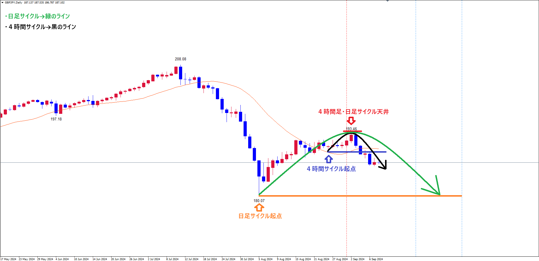 今後は、起点オレンジのライン(8/5の安値180.07)以下の底の時間帯・本数まで、サイクル底へ向けて下落の波が継続していく想定です✅