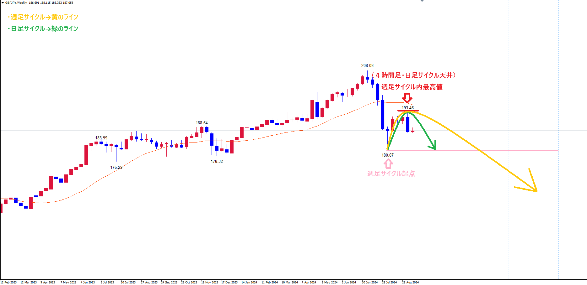 ポンド円の週足サイクルも、レフトトランスレーションのサイクルを形成する想定で、