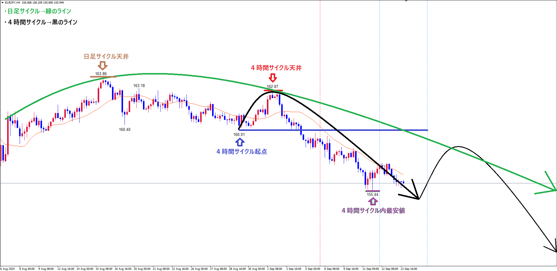 今回のサイクルは、既に起点青のライン(8/29の安値160.01)を割れている事で、レフトトランスレーションのサイクルという事が確定して、