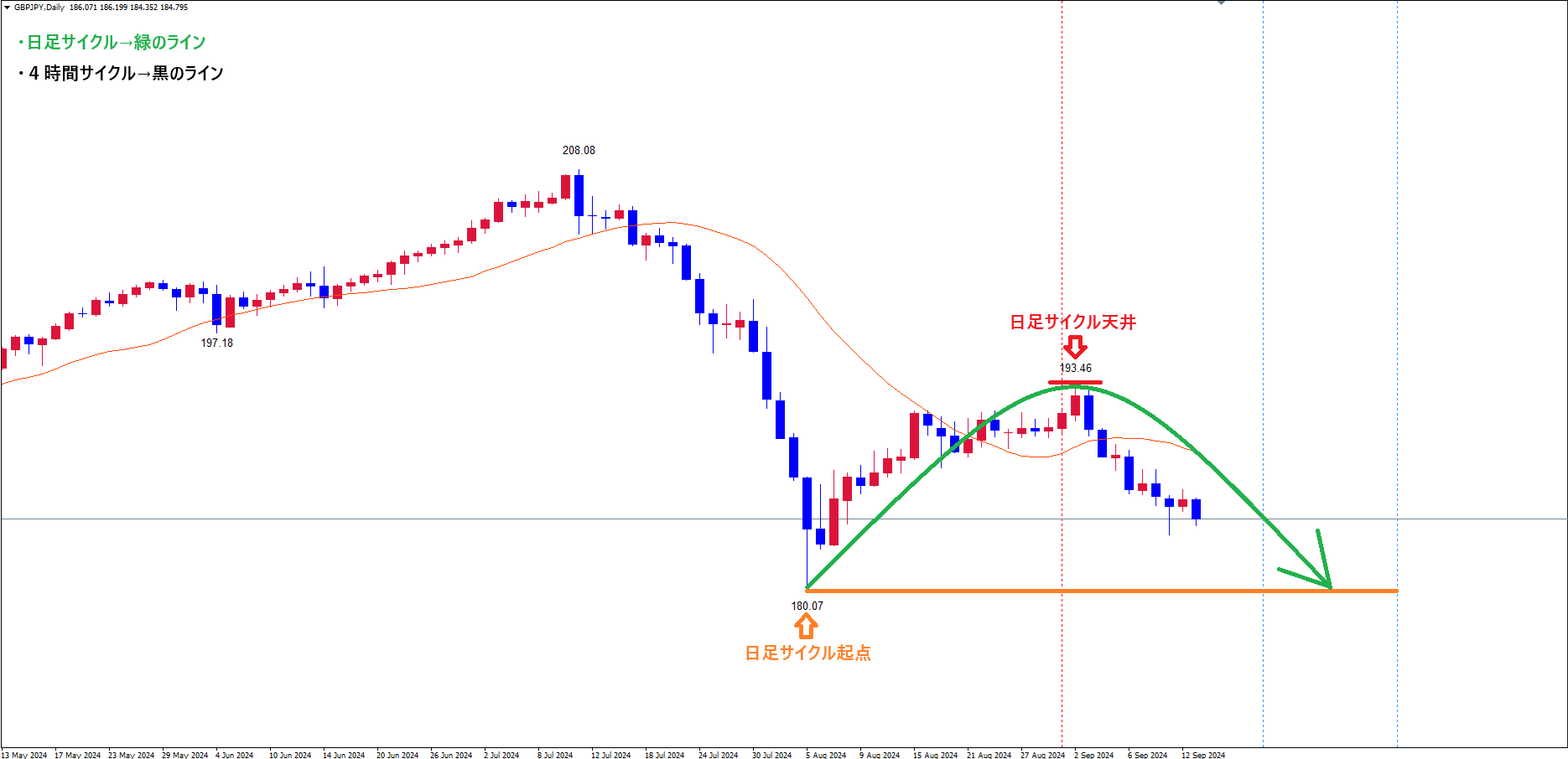 今回のサイクルは、既に起点青のライン(8/26の安値189.48)を割れている事で、レフトトランスレーションのサイクルという事が確定して、