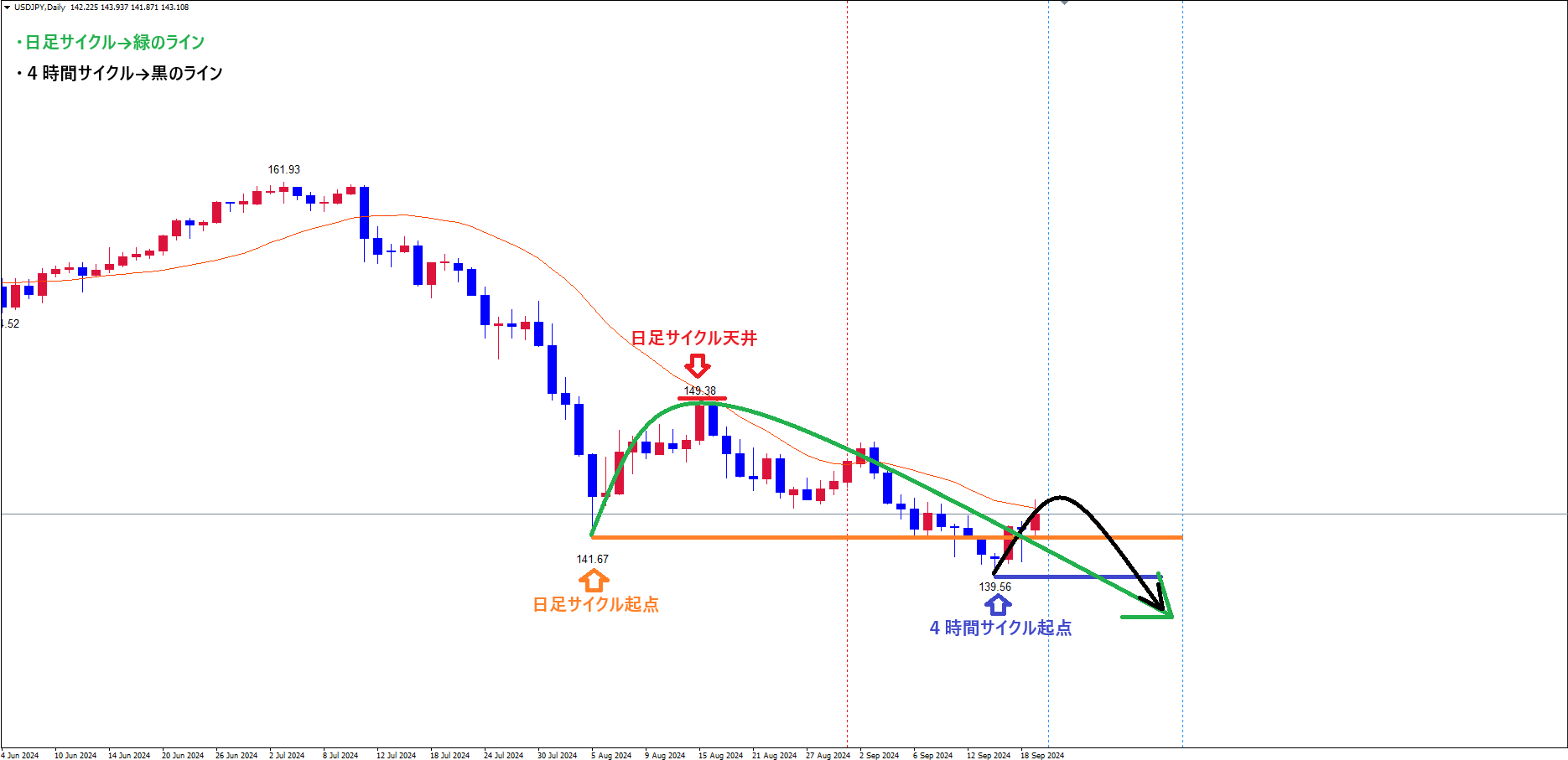 そして、直近のサイクル内最安値(4時間サイクル起点)青のライン(9/16の安値139.56)は、底の時間帯・本数に入る前に付けている事で、