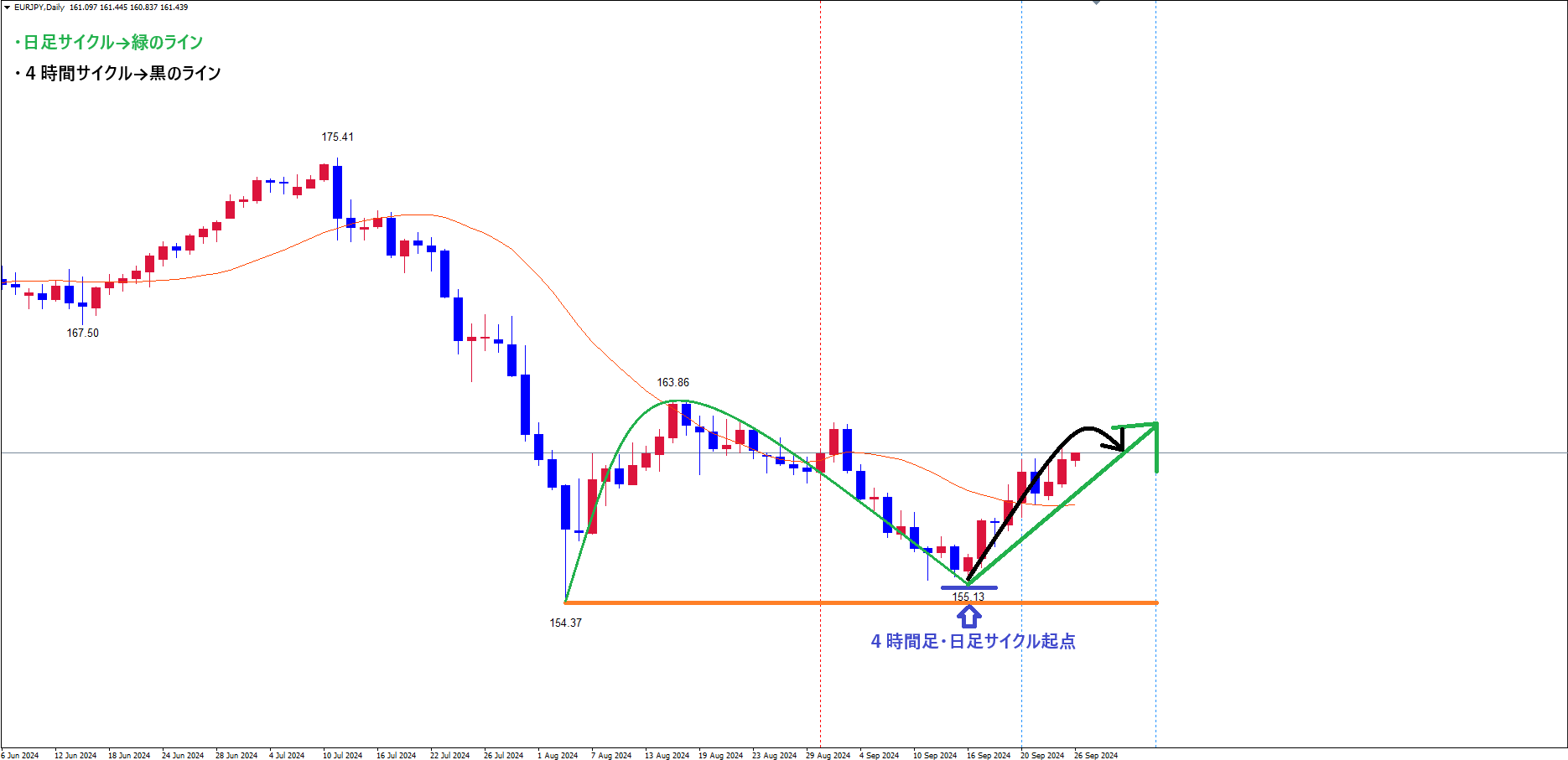 日足のサイクル内最安値(4時間サイクル起点)青のライン(9/16の安値155.13)を割れない可能性が高いので、
