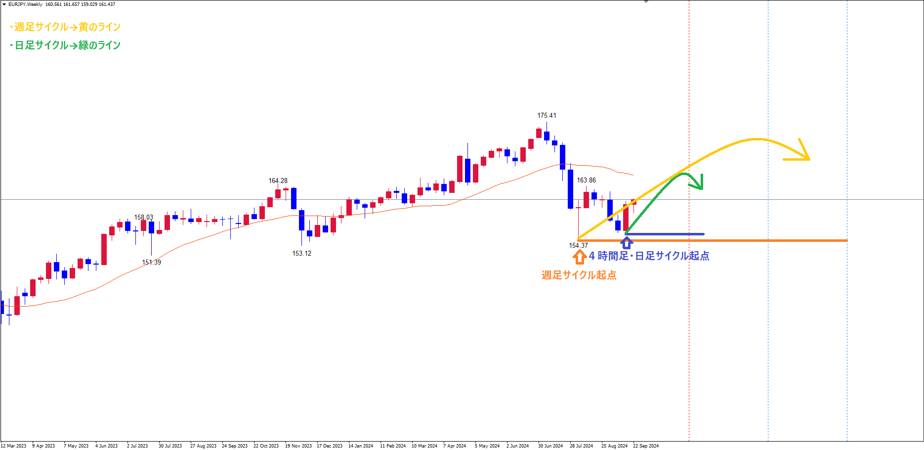 これまで見ている起点オレンジのライン(8/5の安値154.37)からの日足サイクルも、青のライン(9/16の安値155.13)で底を付けていると見ています。