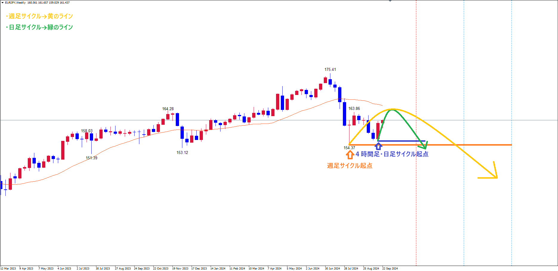 8/15の高値163.86 or 今回の日足サイクル天井で、週足サイクルも天井を付け、底へ向けての下落の波に切り替わるパターンです✅