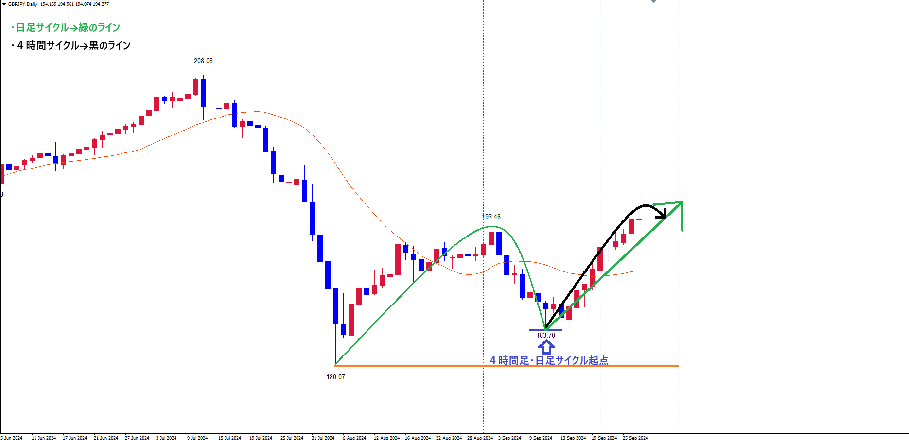 これまで見ている起点オレンジのライン(8/5の安値180.07)からの日足サイクルも、青のライン(9/11の安値183.70)で底を付けていると見ています。