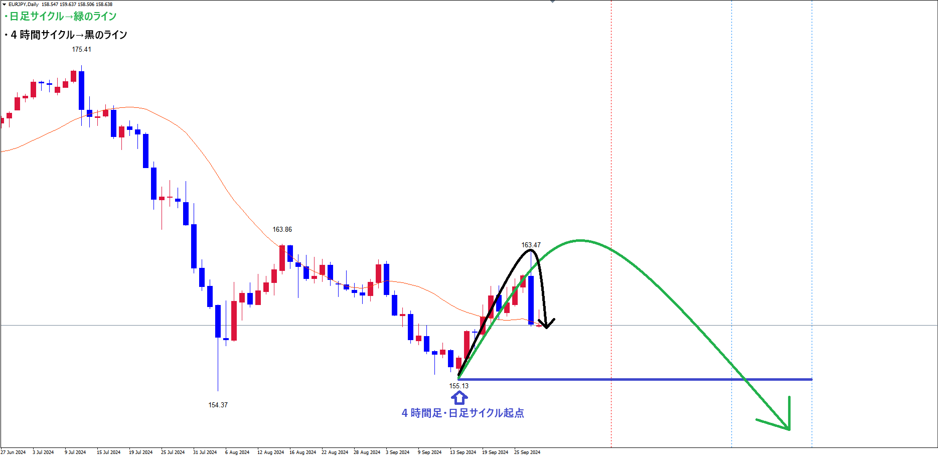 9/27の高値163.47 or 次回の4時間サイクル天井で、週足サイクルも天井を付け、底へ向けての下落の波に切り替わるパターンです✅
