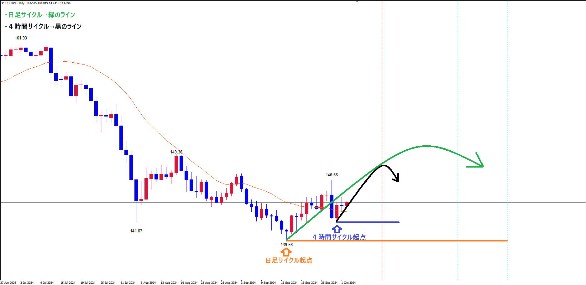4時間サイクルは、青のライン(9/30の高値141.63)で、底(日足の上昇の波の押し安値)を付けているので、