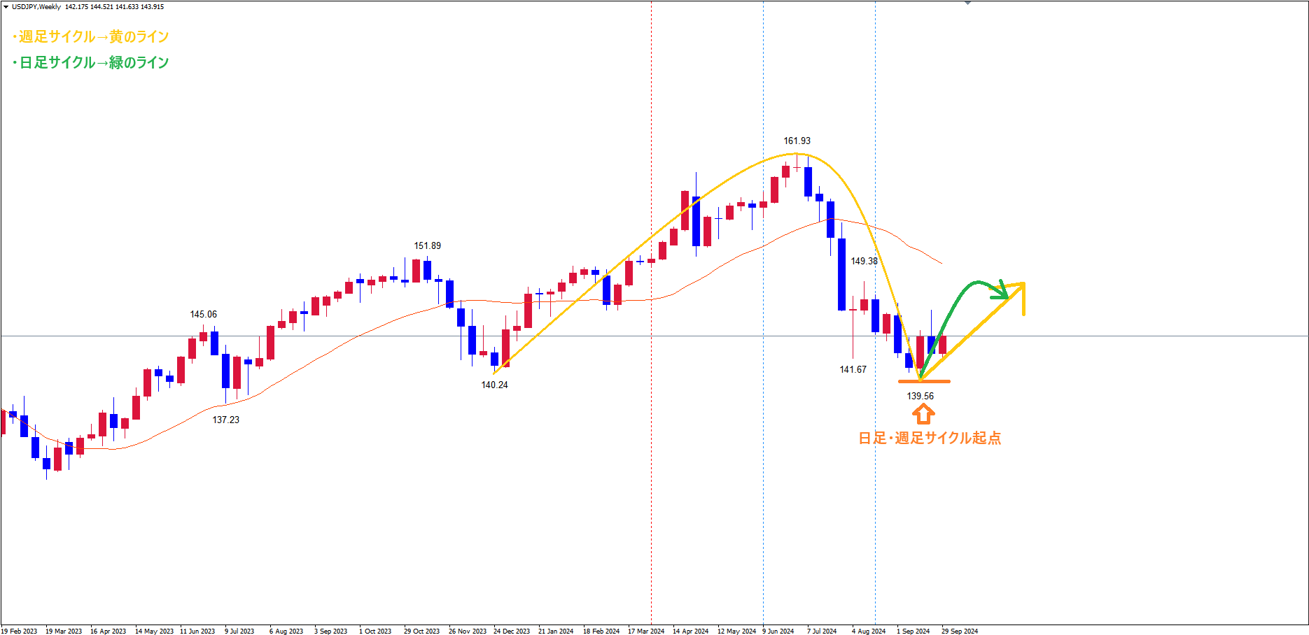 日足サイクルは、起点オレンジのライン(9/16の安値139.56)から、現在13本目です✅