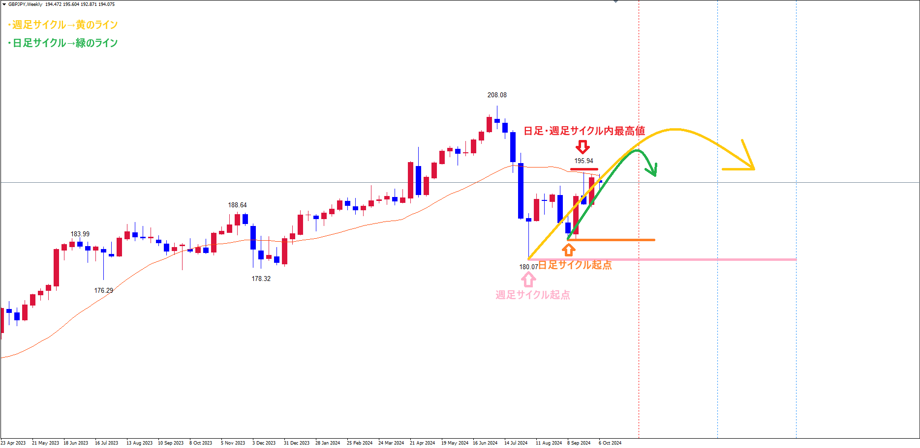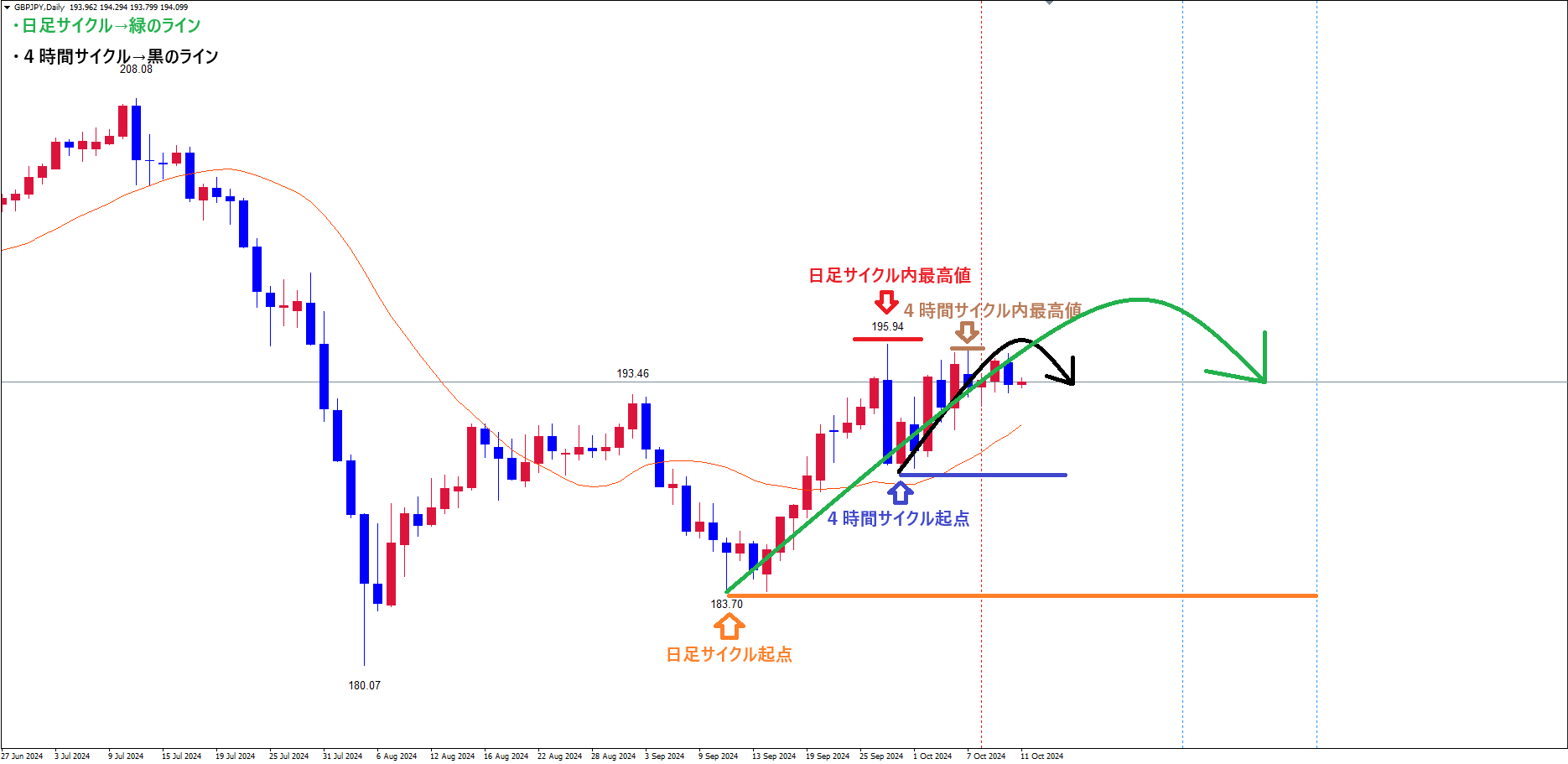 ・茶のライン(10/7の高値195.60)超え =今回4時間サイクルがライトトランスレーションを形成 = 日足・週足サイクル(パターン②)