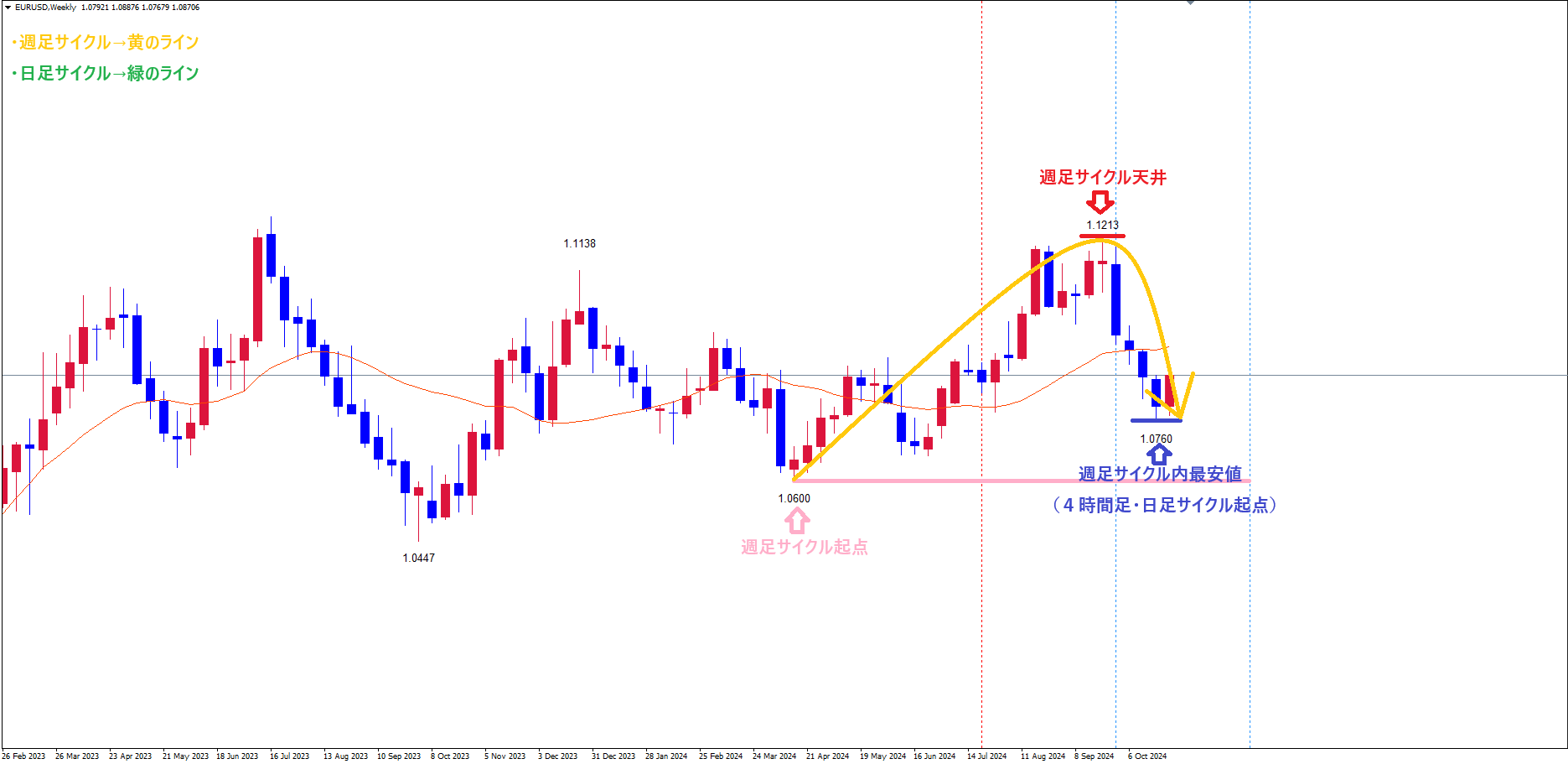 週足サイクルも、起点桃のライン(4/16の安値1.0600)からのサイクルが継続し、