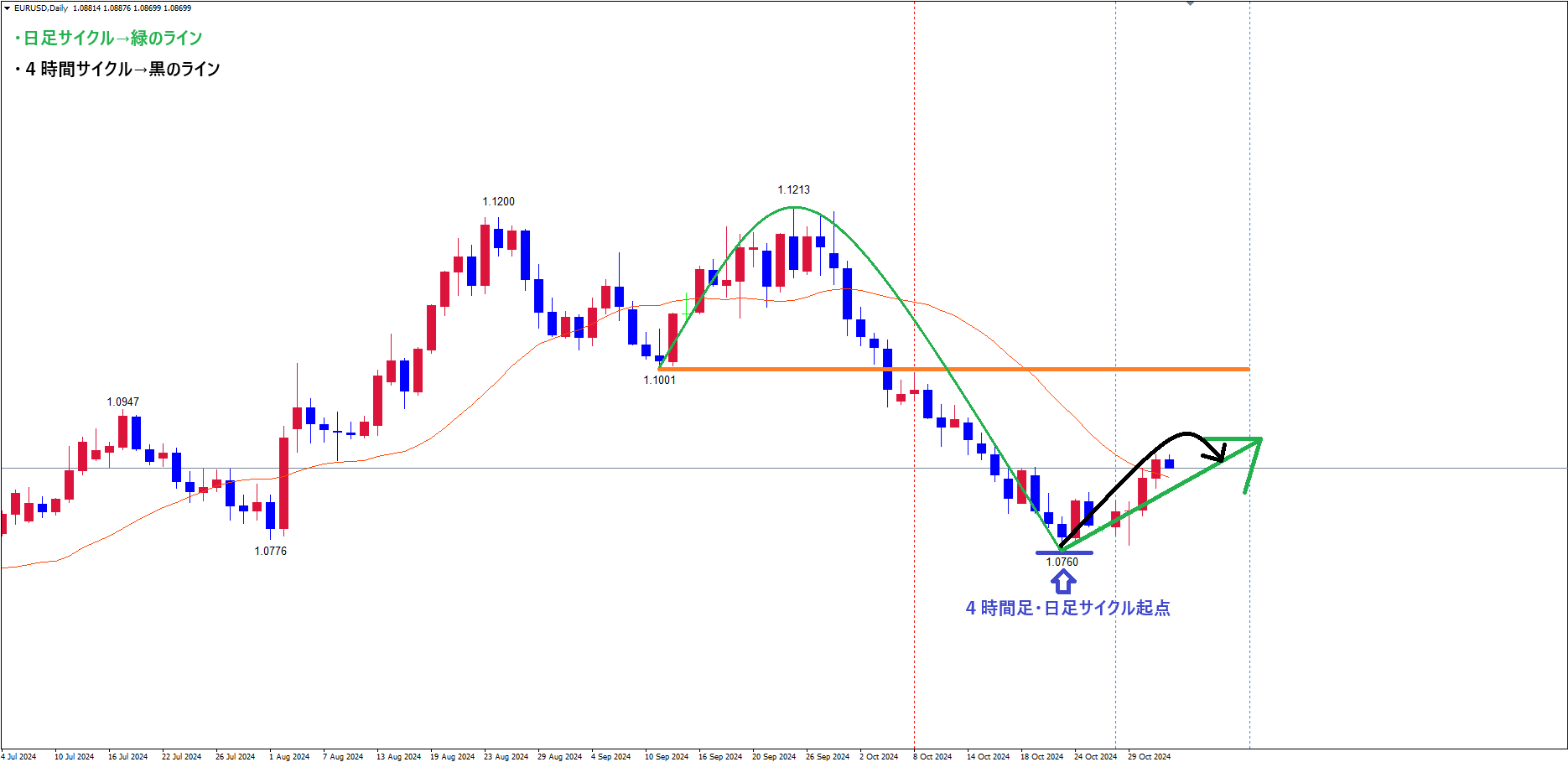日足サイクル内最安値(4時間サイクル起点)青のライン(10/23の安値1.0760)を割れない可能性が高くなっている事で、