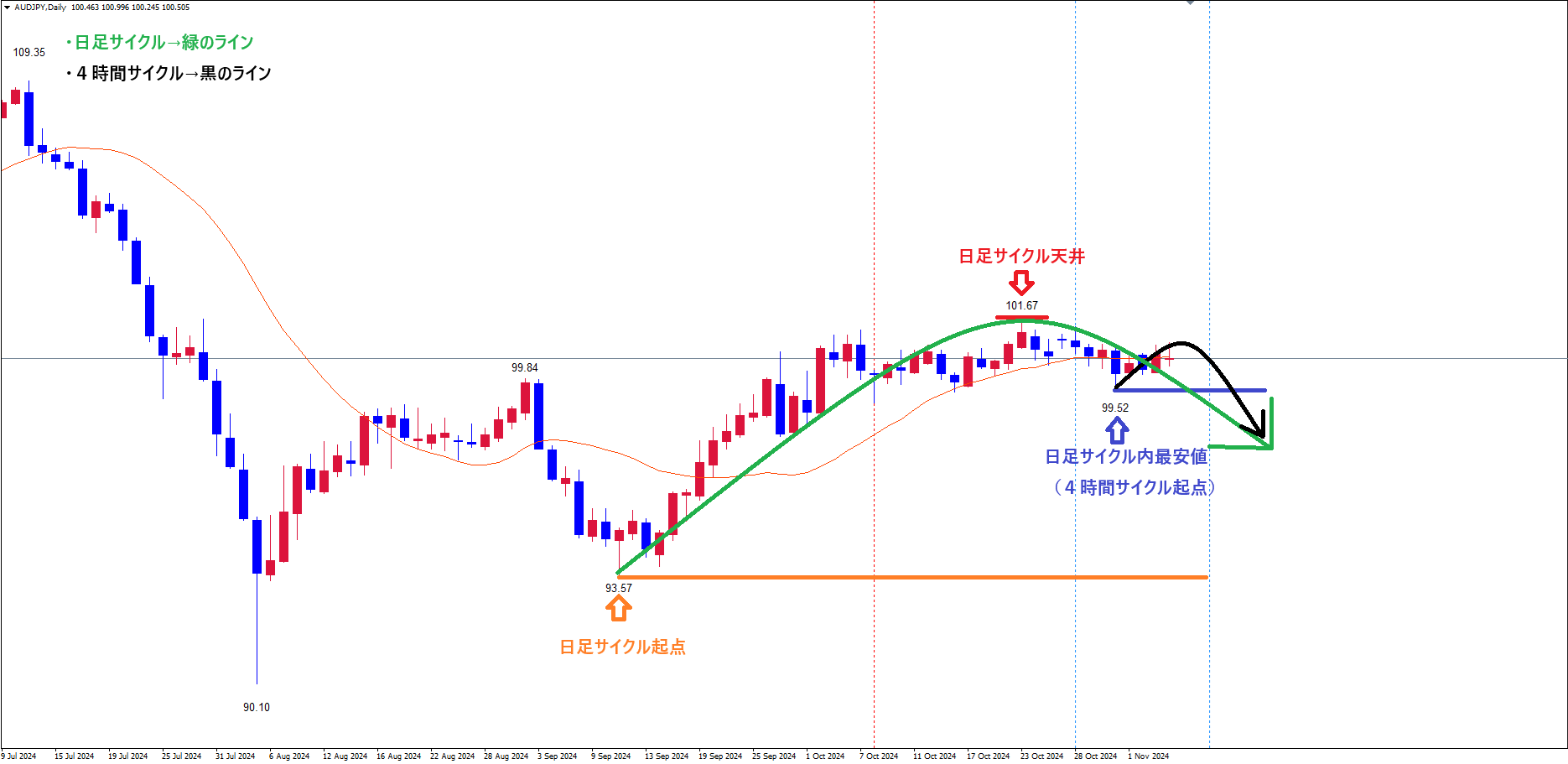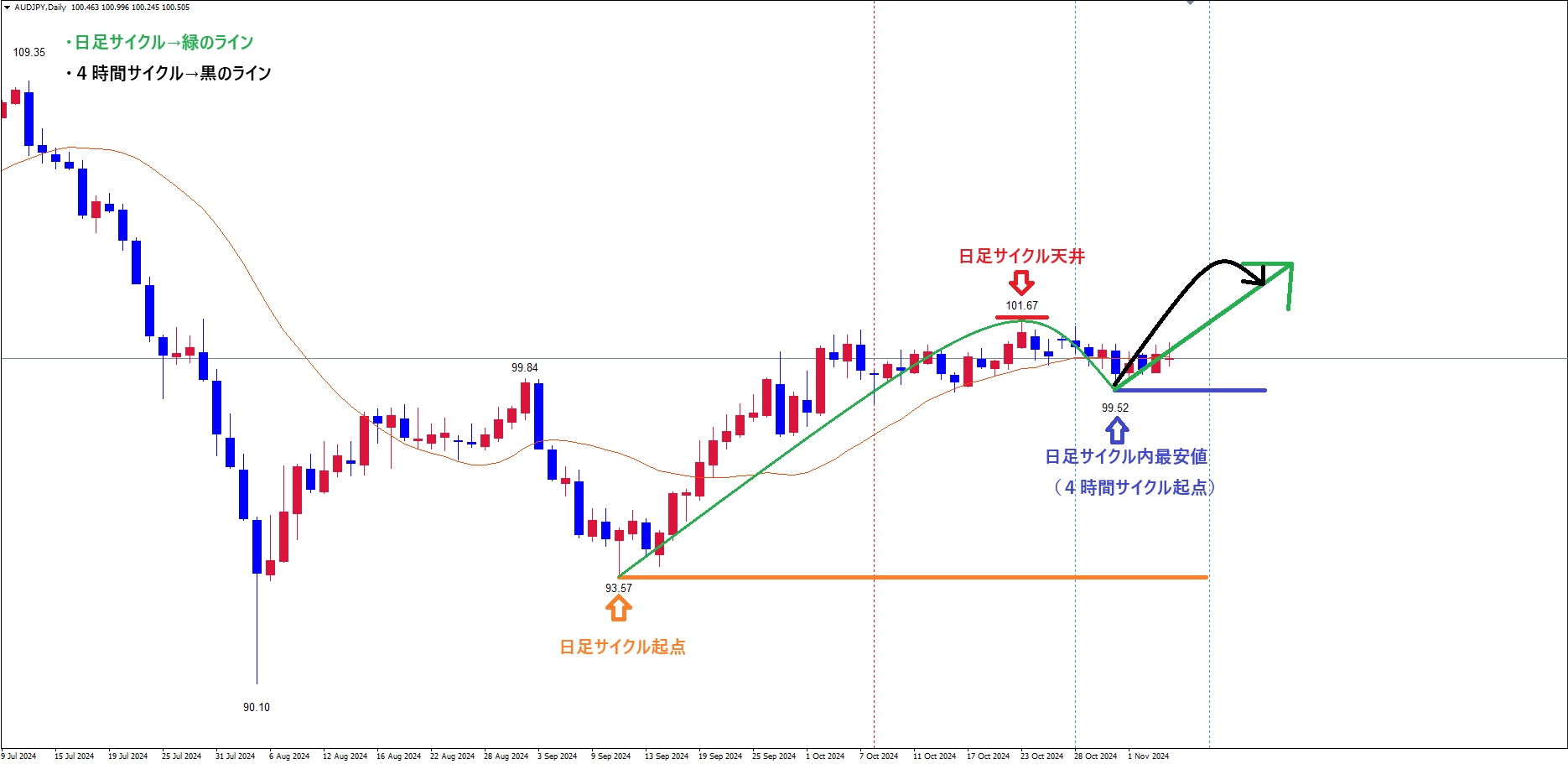 直近の日足サイクル内最安値(4時間サイクル起点)青のライン(10/31の安値99.52)で、日足サイクルも底を付けて反転しているパターンです✅