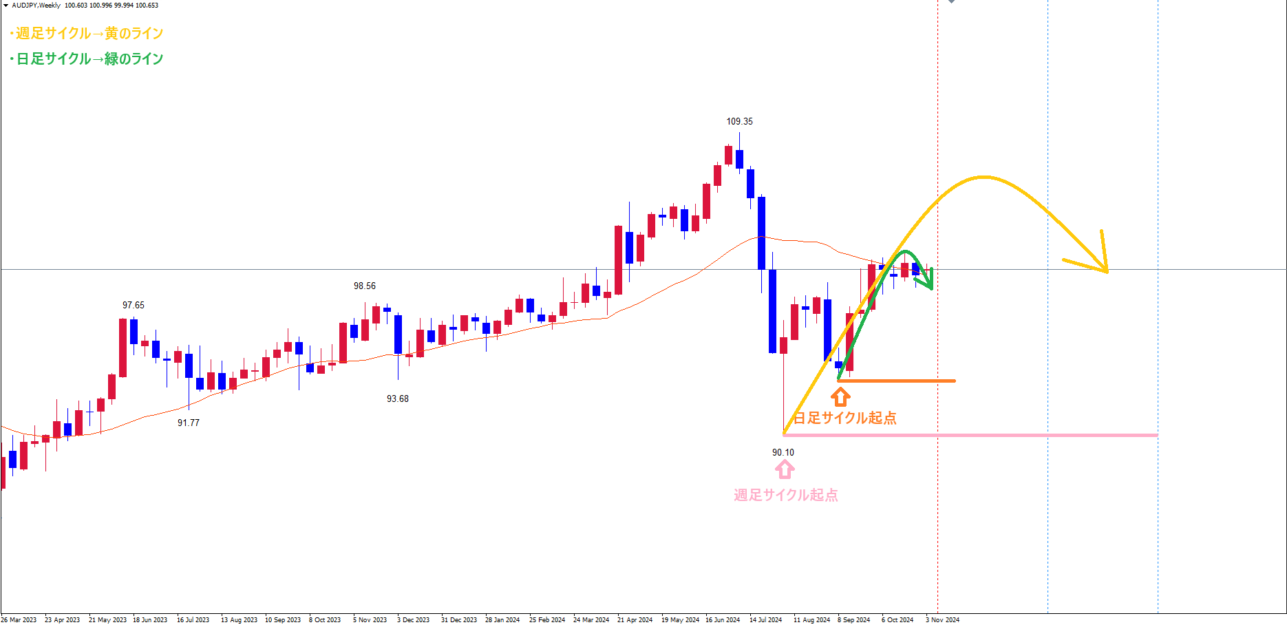 この場合、日足サイクルは、起点青のライン(10/31の安値99.52)から、現在5本目で、