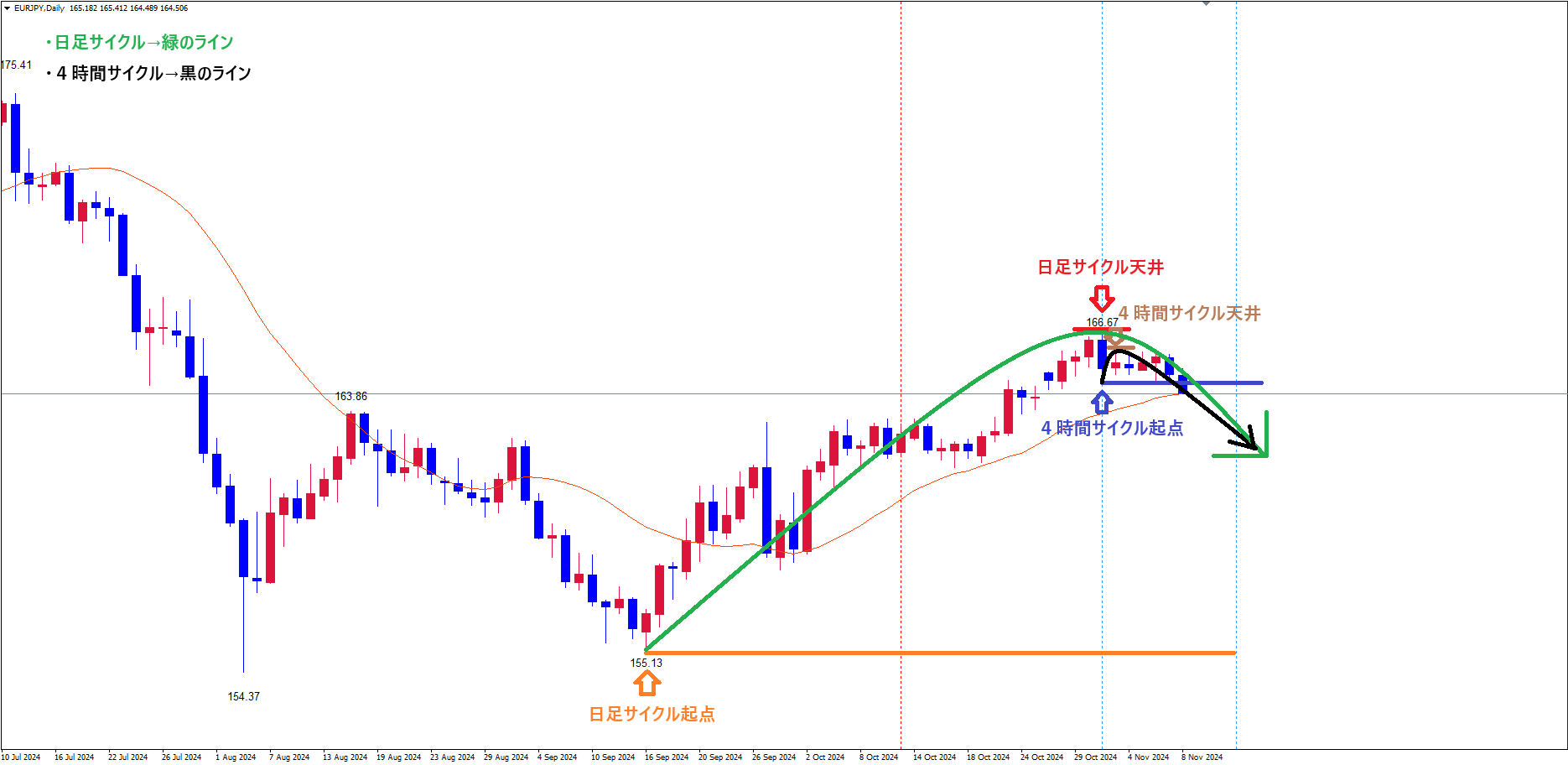 今回の4時間サイクルがレフトトランスレーション(下落トレンド)のサイクル(日足レベルで高値切り下げ、安値更新の動き)を形成している事で、