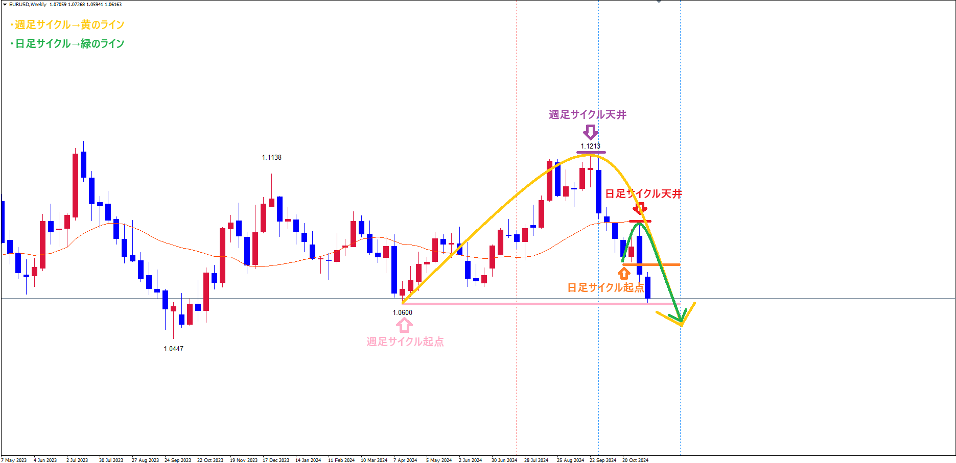 週足サイクルは、起点桃のライン(4/16の安値1.0600)から、現在31本目で、