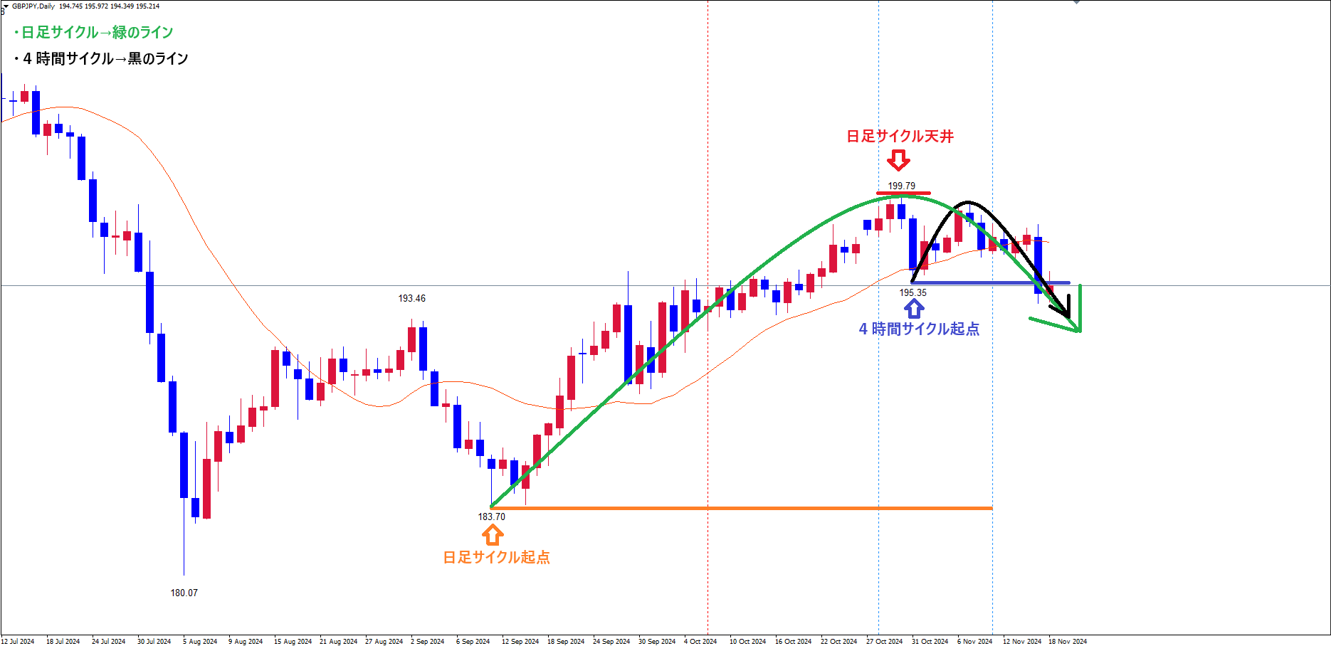 今回の4時間サイクルがレフトトランスレーション(下落トレンド)のサイクル(日足レベルで高値切り下げ、安値更新の動き)を形成している事で、