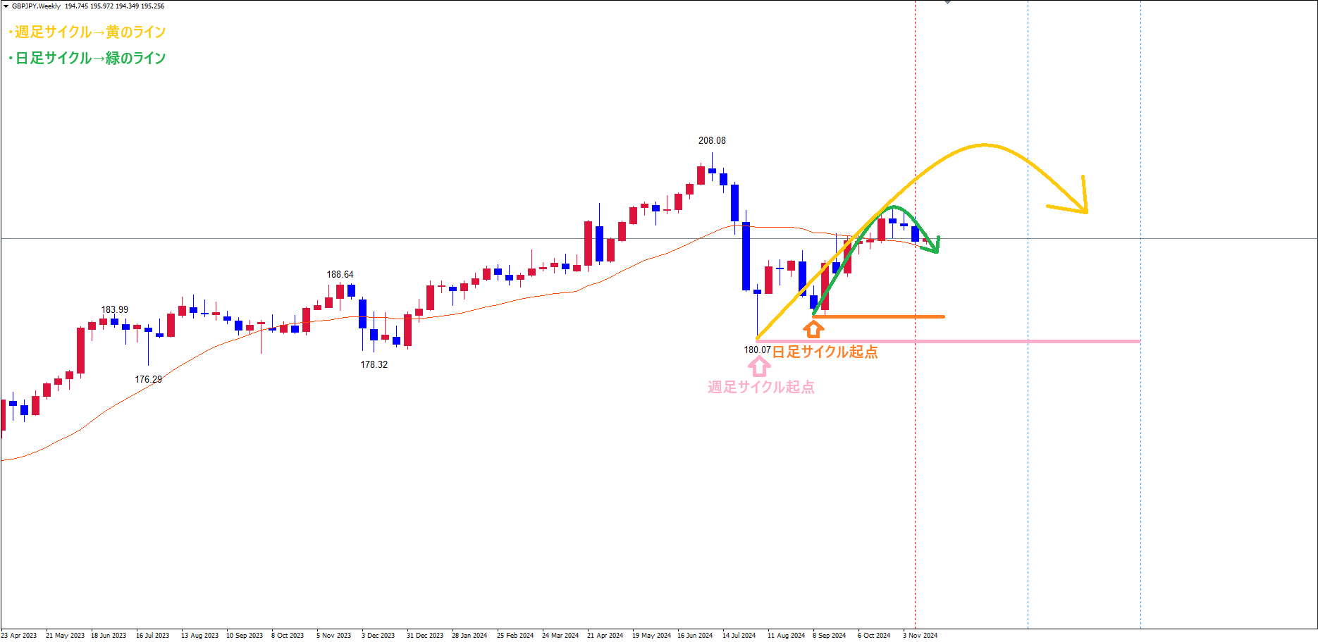週足サイクルは、起点桃のライン(8/5の安値180.07)から、現在16本目の形です✅