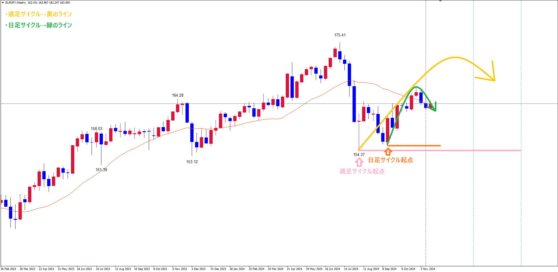 週足サイクルは、起点桃のライン(8/5の安値154.37)から、現在16本目です✅