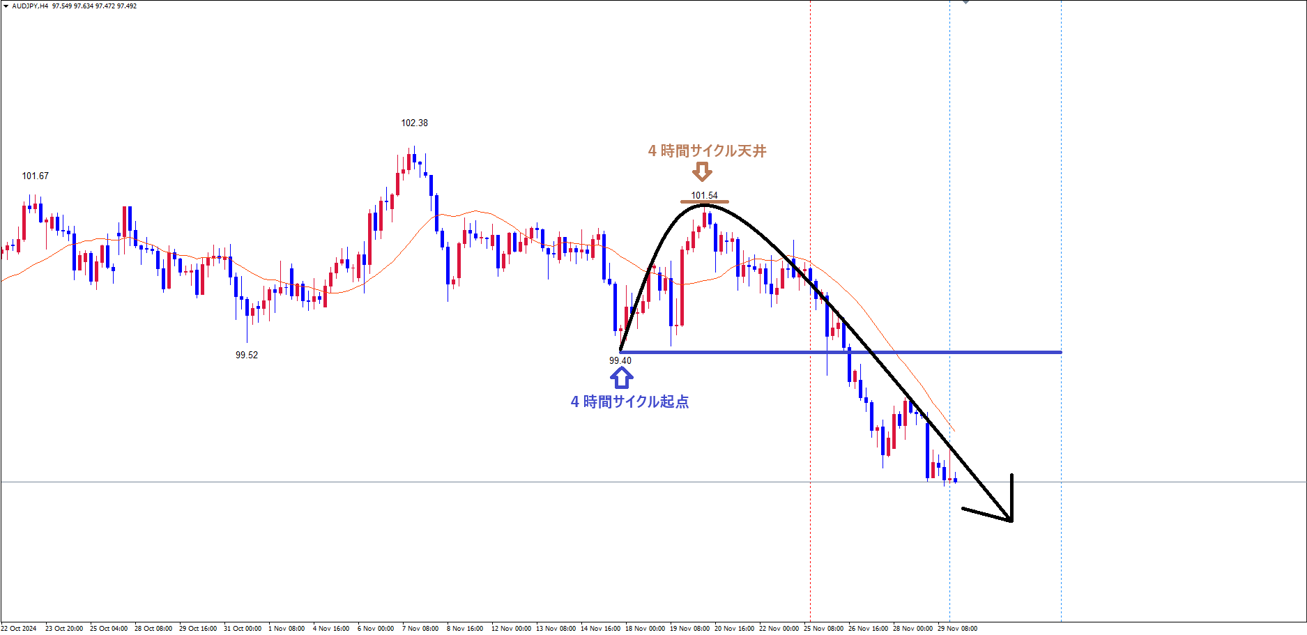 既に起点青のライン(11/15の安値99.40)を割れている事で、理論的にレフトトランスレーション(下落トレンド)のサイクルという事が確定し、