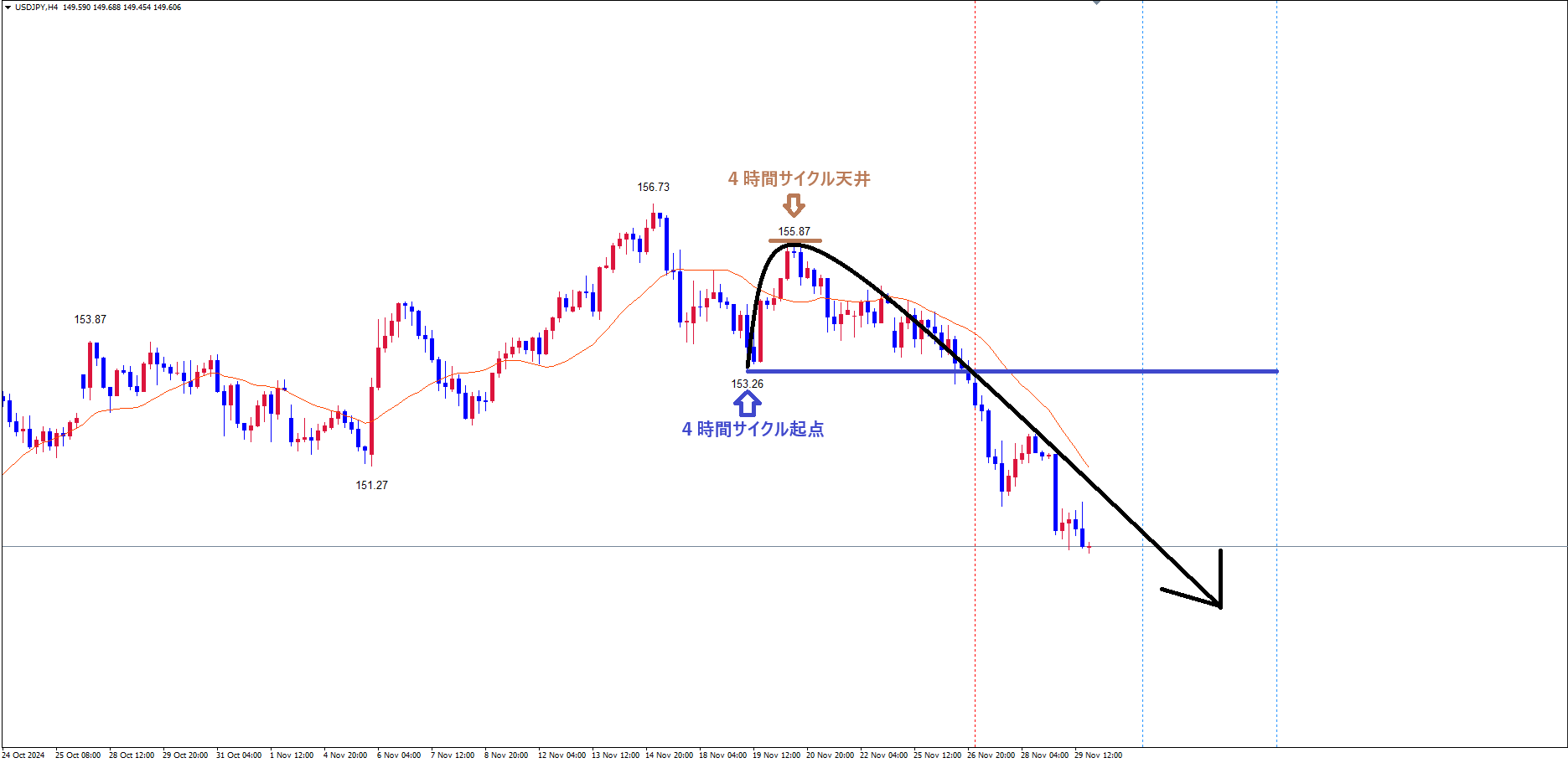 既に起点青のライン(11/19の安値153.26)を割れている事で、理論的にレフトトランスレーション(下落トレンド)のサイクルという事が確定し、