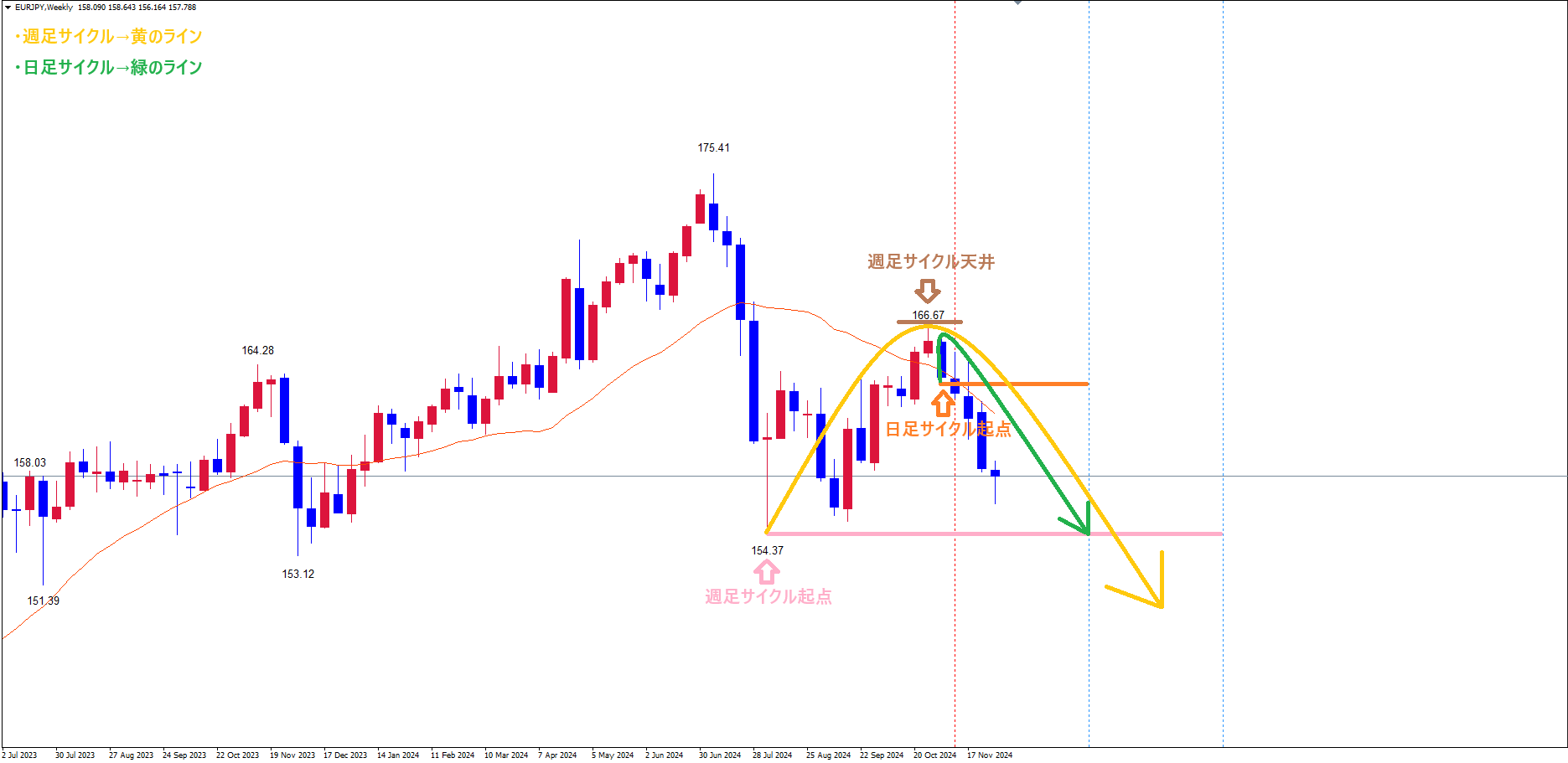 週足サイクルも、茶のライン(10/31の高値166.67)で天井を付け、底へ向けて下落の波、方向感:下方向 という認識です✅
