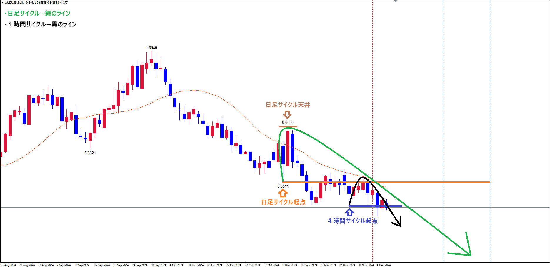 既に起点オレンジのライン(11/6の安値0.6511)を割れている事で、理論的にレフトトランスレーション(下落トレンド)のサイクルという事が確定し、