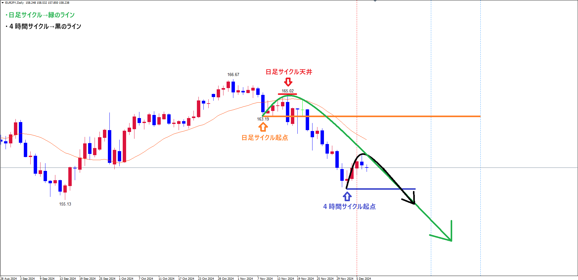 現在は、直近のサイクル内最高値茶のライン(12/6の高値159.55)で、天井を付け、底へ向けて下落の波、方向感:下方向 に切り替わっている事を考えておきます✅